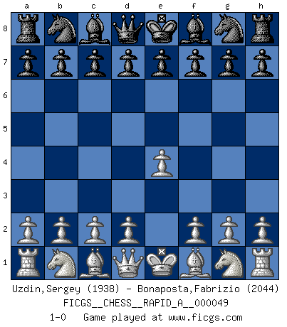 Last move : 1-0 2008 September 7 20:51:59 [Event "FICGS__CHESS__RAPID_A__000049"] [Site "FICGS"] [Date "2008.08.08"] [Round "1"] [White "Uzdin,Sergey"] [Black "Bonaposta,Fabrizio"] [Result "1-0"] [WhiteElo "1938"] [BlackElo "2044"] 1.e4 1-0 This chess game has been lost on time (started : 2008.08.08 12:57:46) King's pawn Opening Player White won this chess game. Follow this game move after move (download)Fischer is an American Chess tragedy on par with Morphy and Pillsbury. (Mig Greengard) Strategie ist, wie man ein Mädchen auf den Rücksitz bekommt. Taktik ist, was man tut, wenn man dann dort ist. (Anonymous) La señal de un Gran Maestro es su habilidad de ganar una partida rápidamente y sin dolor. (Irving Chernev) RxDa4 pat (...) He is a liar. I just don't know what the lie is yet. (Horatio Caine, C.S.I. Miami)