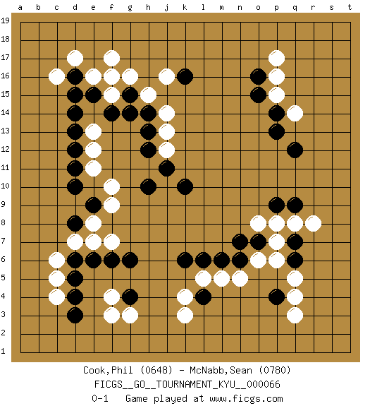 Last move : 0-1 2008 November 16 9:11:8 [Event "FICGS__GO__TOURNAMENT_KYU__000066"] [Site "FICGS"] [Date "2008.08.08"] [Round "1"] [Black "Cook,Phil"] [White "McNabb,Sean"] [Result "0-1"] [Rating 1 "0648"] [Rating 2 "0780"] 1.d16 q3 2.p4 q4 3.q6 q5 4.d4 p17 5.o16 p16 6.d10 f17 7.f16 g16 8.p14 p15 9.o15 q14 10.p13 e16 11.d14 d17 12.e15 f15 13.f14 c16 14.d15 f3 15.g4 f4 16.g15 f16 17.q12 c6 18.d6 d7 19.e6 c5 20.d5 c4 21.d3 g3 22.d8 e7 23.f6 f7 24.g6 k3 25.l4 k4 26.k6 l5 27.l6 m5 28.m6 n5 29.n6 o6 30.k16 h15 31.g14 j16 32.k10 o8 33.o7 p7 34.n7 p6 35.q7 q8 36.q9 r8 37.p9 p8 38.h14 j14 39.h13 j13 40.h12 j12 41.j11 f10 42.h10 e13 43.d13 e12 44.d12 e11 45.d11 e8 46.e9 f9 0-1 This go game has been lost on time (started : 2008.08.08 13:23:34) Here are the names of the openings (joseki) played in the four corners : Corner q4 : q3 p4 Komoku (Somok, Xiao~mu`) 3-4 Point. The komoku (3-4) point is the traditional corner enclosure move.. Corner q16 : p17 o16 Mokuhazushi (Waemok, Wai`mu`) 5-3 Point. The mokuhazushi (5-3) point was popular in the Edo period in Japan (1600 - 1867). It emphasizes influence; territorially, it is inferior to the 3-4 point. Corner d16 : d16 f17 Hoshi (Hwajeom, Seongjeom, Xingwei`) 4-4 Point. The star or hoshi (4-4) point, emphasizing influence at the potential expense of territory. Ikken Kakari (Hankan Keolch'im, Yi Gua`jiao~, 1-Space Low Approach). White 2 is the standard approach move to the 4-4. Corner d4 : d4 f3 Hoshi (Hwajeom, Seongjeom, Xingwei`) 4-4 Point. The star or hoshi (4-4) point, emphasizing influence at the potential expense of territory. Ikken Kakari (Hankan Keolch'im, Yi Gua`jiao~, 1-Space Low Approach). White 2 is the standard approach move to the 4-4. Player White won this Go (weiqi, baduk) game. Follow this game move after move (download)The saki bottle shape is negative. (Anonymous) All politicians must be presumed guilty until they are proven innocent. (Dinesh De Silva)
