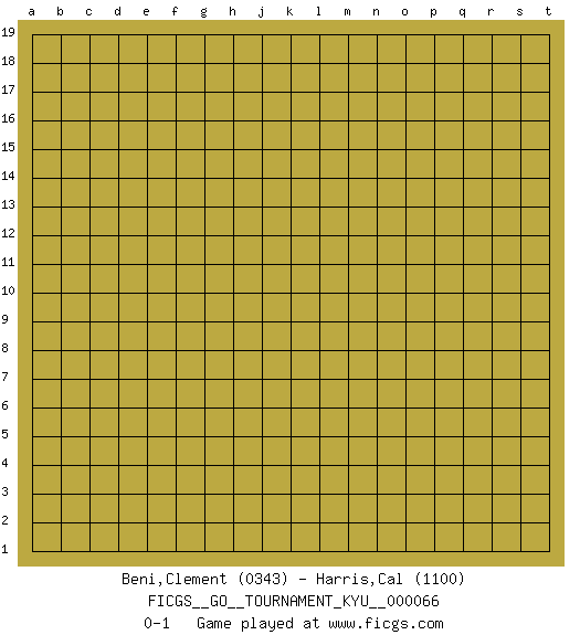 Last move : 0-1 2008 September 7 20:51:59 [Event "FICGS__GO__TOURNAMENT_KYU__000066"] [Site "FICGS"] [Date "2008.08.08"] [Round "1"] [Black "Beni,Clement"] [White "Harris,Cal"] [Result "0-1"] [Rating 1 "0343"] [Rating 2 "1100"] 0-1 This go game has been lost on time (started : 2008.08.08 13:23:34) Here are the names of the openings (joseki) played in the four corners : Player White won this Go (weiqi, baduk) game. Follow this game move after move (download)Don't make empty triangles. (Anonymous) If we don't succeed, we run the risk of failure. (George W. Bush)
