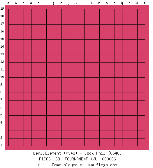 Last move : 0-1 2008 September 7 20:51:59 [Event "FICGS__GO__TOURNAMENT_KYU__000066"] [Site "FICGS"] [Date "2008.08.08"] [Round "1"] [Black "Beni,Clement"] [White "Cook,Phil"] [Result "0-1"] [Rating 1 "0343"] [Rating 2 "0648"] 0-1 This go game has been lost on time (started : 2008.08.08 13:23:34) Here are the names of the openings (joseki) played in the four corners : Player White won this Go (weiqi, baduk) game. Follow this game move after move (download)Six eyes in a rectangle are alive. (Anonymous) Patience, use the Force, think ! (Obi-Wan Kenobi in Star Wars ep.2)