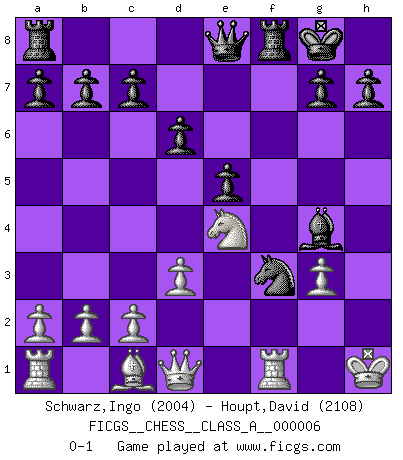 Last move : 0-1 2006 November 2 16:52:14 [Event "FICGS__CHESS__CLASS_A__000006"] [Site "FICGS"] [Date "2006.08.01"] [Round "1"] [White "Schwarz,Ingo"] [Black "Houpt,David"] [Result "0-1"] [WhiteElo "2004"] [BlackElo "2108"] 1.e4 e5 2.Bc4 Nf6 3.Nf3 Nc6 4.Ng5 Bc5 5.Nxf7 Bxf2+ 6.Kxf2 Nxe4+ 7.Ke3 Qh4 8.g3 Nxg3 9.hxg3 Qd4+ 10.Kf3 O-O 11.Kg2 Qxc4 12.Ng5 Qd5+ 13.Nf3 Nd4 14.Rf1 d6 15.Nc3 Qc6 16.d3 Bg4 17.Ne4 Nxf3 18.Kh1 Qe8 0-1 Bishop's Opening : Berlin defense Kingside Castling by player Black (move 10) Player Black won this chess game. Follow this game move after move (download)Fischer Chess play was always razor-sharp, rational and brilliant. One of the best ever. (Dave Regis) Verschiedene, sehr schätzbare und im Laufe des Lebens nützliche Eigenschaften des Geistes können durch das Schachspiel erworben und gekräftigt werden, so dass sie zu Gewohnheiten werden, die uns nie im Stich lassen. (Benjamin Franklin) Cuando le juegas a Fischer, no es una cuestion de si vas a ganar o perder. Es una cuestion de si vas a sobrevivir. (Boris Spassky) Tous ces prétendus hommes politiques sont les pions, les Cavaliers, les Tours ou les Fous d'une partie d'échecs qui se jouera tant qu'un hasard ne renversera pas l'échiquier. (Honoré de Balzac) No enterprise is more likely to succeed than one concealed from the enemy until it is ripe for execution. (Niccolo Machiavelli)