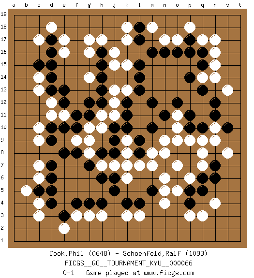 Last move : 0-1 2008 December 7 22:3:52 [Event "FICGS__GO__TOURNAMENT_KYU__000066"] [Site "FICGS"] [Date "2008.08.08"] [Round "1"] [Black "Cook,Phil"] [White "Schoenfeld,Ralf"] [Result "0-1"] [Rating 1 "0648"] [Rating 2 "1093"] 1.d4 q17 2.q16 r17 3.d16 q3 4.q5 r4 5.r6 c10 6.d10 c9 7.d9 c7 8.d7 c6 9.d6 c14 10.d14 c13 11.d13 k3 12.k4 l3 13.l4 n4 14.q10 g17 15.h16 g16 16.o16 r16 17.q15 r15 18.q13 s13 19.r12 f3 20.g4 g3 21.h4 h3 22.c15 o17 23.m16 m18 24.l17 k18 25.l18 n17 26.n16 n6 27.m5 n5 28.k10 g14 29.g12 n9 30.n11 k8 31.j9 j7 32.j6 h7 33.g7 q8 34.n7 o7 35.o8 n8 36.h6 m7 37.h8 k6 38.j5 g8 39.j8 k7 40.f8 g9 41.m10 o10 42.p8 o11 43.o12 k9 44.j10 f9 45.e8 d12 46.l9 m8 47.l8 l7 48.p11 p9 49.p10 q9 50.p7 q7 51.o6 p6 52.n7 o5 53.q6 o7 54.p17 p18 55.p16 h17 56.p5 o9 57.f10 g10 58.f11 h11 59.h12 j11 60.k11 j12 61.h13 k13 62.m12 r10 63.r11 q14 64.p14 r14 65.g11 h10 66.k12 j13 67.h14 j16 68.h15 k15 69.s10 r9 70.l14 j15 71.l15 k17 72.l13 c17 73.d17 d18 74.r7 s8 75.p4 p3 76.e3 c3 77.f4 c4 78.c5 b5 79.d5 e11 80.e10 d11 81.e13 e17 82.e12 e16 83.d15 e2 0-1 Here are the names of the openings (joseki) played in the four corners : Corner q16 : q17 q16 Komoku (Somok, Xiao~mu`) 3-4 Point. The komoku (3-4) point is the traditional corner enclosure move.. Corner q4 : q3 q5 Komoku (Somok, Xiao~mu`) 3-4 Point. The komoku (3-4) point is the traditional corner enclosure move.. Ikken Takagakari (Hankan Nop'dakeolch'im, Yi Gaogua`jiao~, 1-Space High Approach). The 5-4 approach move has become more popular in modern times, as modern Go emphasizes speed and influence. Corner d4 : d4 c9 Hoshi (Hwajeom, Seongjeom, Xingwei`) 4-4 Point. The star or hoshi (4-4) point, emphasizing influence at the potential expense of territory. Corner d16 : d16 c14 Hoshi (Hwajeom, Seongjeom, Xingwei`) 4-4 Point. The star or hoshi (4-4) point, emphasizing influence at the potential expense of territory. Ikken Kakari (Hankan Keolch'im, Yi Gua`jiao~, 1-Space Low Approach). White 2 is the standard approach move to the 4-4. Player White won this Go (weiqi, baduk) game. Follow this game move after move (download)Learning josekis by heart is useless if you don't try departing from them. (Pierre Audouard) You must do what you feel is right... of course. (Obi-Wan Kenobi in Star Wars ep.4)