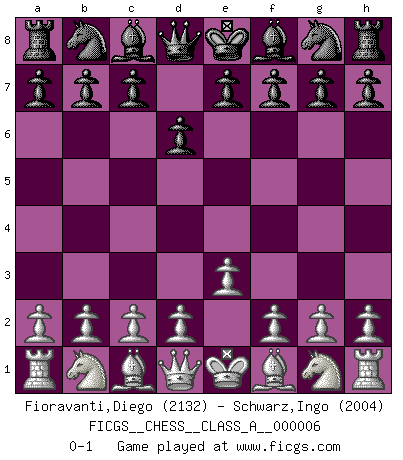 Last move : 0-1 2006 August 15 19:20:26 [Event "FICGS__CHESS__CLASS_A__000006"] [Site "FICGS"] [Date "2006.08.01"] [Round "1"] [White "Fioravanti,Diego"] [Black "Schwarz,Ingo"] [Result "0-1"] [WhiteElo "2132"] [BlackElo "2004"] 1.e3 d6 0-1 Van't Kruijs Opening Player Black won this chess game. Follow this game move after move (download)I am the best player in the world and I am here to prove it. (Bobby Fischer) Schach ist ein Kampf gegen den Fehler. (Johannes Herrman Zukertort) Dios mío, Bobby Fischer juega tan simple. (Alexei Suetin) Une platitude souvent récitée à propos des Echecs est qu'une des choses les plus difficiles à réaliser est de gagner une position gagnante. Cela ne manque pas de sens mais, pour ma part, j'ai toujours trouvé plus difficile de gagner une position perdante. (Tim Krabbe) There are two kinds of people in the world, my friend. Those who have a loaded gun and those who dig. You dig ! (Blondie in The Good, The Bad and The Ugly)