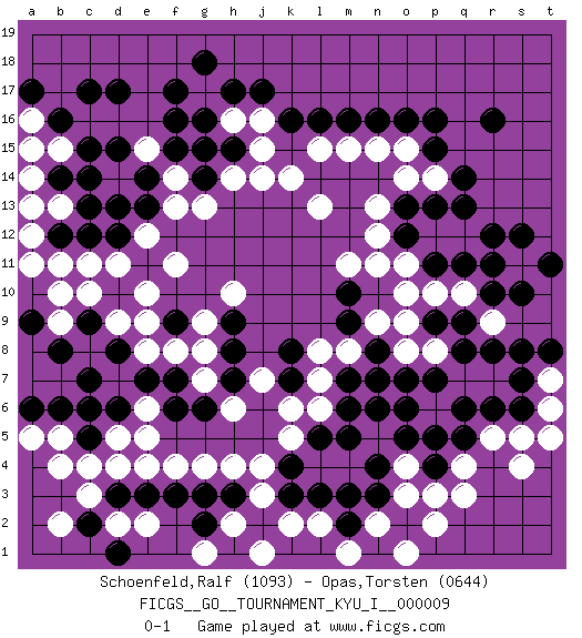 Last move : 0-1 2008 December 13 13:32:27 [Event "FICGS__GO__TOURNAMENT_KYU_I__000009"] [Site "FICGS"] [Date "2008.08.08"] [Round "1"] [Black "Schoenfeld,Ralf"] [White "Opas,Torsten"] [Result "0-1"] [Rating 1 "1093"] [Rating 2 "0644"] 1.r16 q4 2.d17 d4 3.l16 l8 4.k3 o11 5.n4 f11 6.f3 p14 7.p16 j16 8.h17 k5 9.d10 e10 10.c7 f4 11.e3 d9 12.c9 c10 13.d8 d11 14.c14 e4 15.d3 c3 16.c5 c4 17.q9 q7 18.r12 j3 19.k4 j4 20.l5 k2 21.l3 r9 22.r10 l2 23.m3 l15 24.n16 l6 25.m5 q10 26.p9 r11 27.s10 s11 28.q11 p10 29.s12 q12 30.t11 o9 31.r8 p8 32.q8 r7 33.s8 o3 34.m6 l7 35.p7 o8 36.o6 p5 37.o5 b9 38.b8 p6 39.o7 m15 40.m16 h16 41.g16 g17 42.f17 g15 43.g18 n7 44.m7 m8 45.n6 b11 46.f15 f14 47.e14 e15 48.f16 b5 49.b6 a5 50.a6 d5 51.c6 b4 52.j2 h2 53.m2 d14 54.e13 s4 55.h3 h4 56.g3 f13 57.d13 g4 58.g2 j1 59.c2 b2 60.d1 e2 61.o2 p2 62.n3 j14 63.j17 o1 64.p3 n2 65.p4 q3 66.q6 o4 67.r6 e8 68.e7 f8 69.a9 c8 70.h1 g1 71.c9 b10 72.d6 e6 73.f6 e5 74.f7 j7 75.q14 l13 76.p11 o10 77.o12 p12 78.r11 n12 79.o13 o14 80.p13 n13 81.q13 g7 82.g6 d2 83.f9 g9 84.h8 g8 85.h7 h6 86.k7 k6 87.k16 k14 88.h15 r5 89.s6 a14 90.b14 a13 91.b16 j15 92.g14 g13 93.c12 a16 94.b12 a12 95.a17 a15 96.c17 n15 97.p15 o15 98.o16 s5 99.q5 t6 100.p4 t7 101.t8 e12 102.d12 h14 103.g15 b15 104.c15 b13 105.n8 n9 106.n7 m1 107.h9 h10 108.d15 p3 109.p5 a11 110.k8 e9 111.m9 m11 112.c13 c11 113.m10 n11 114.s7 t5 0-1 Here are the names of the openings (joseki) played in the four corners : Corner d16 : d17 f11 Komoku (Somok, Xiao~mu`) 3-4 Point. The komoku (3-4) point is the traditional corner enclosure move.. Corner d4 : d4 f3 Hoshi (Hwajeom, Seongjeom, Xingwei`) 4-4 Point. The star or hoshi (4-4) point, emphasizing influence at the potential expense of territory. Ikken Kakari (Hankan Keolch'im, Yi Gua`jiao~, 1-Space Low Approach). Black 2 is the standard approach move to the 4-4. Player White won this Go (weiqi, baduk) game. Follow this game move after move (download)Ikken tobi is never wrong. (Anonymous) Programmer - an organism that turns coffee into software. (Anonymous)