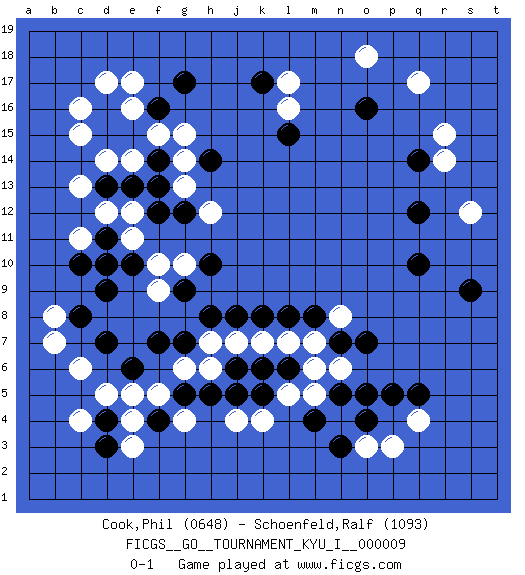 Last move : 0-1 2008 November 17 6:8:29 [Event "FICGS__GO__TOURNAMENT_KYU_I__000009 "] [Site "FICGS"] [Date "2008.08.08"] [Round "1"] [Black "Cook,Phil "] [White "Schoenfeld,Ralf "] [Result "0-1"] [Rating 1 "0648"] [Rating 2 "1093"] 1.d3 q17 2.q5 c16 3.q14 r15 4.o16 d5 5.d7 c4 6.f16 e17 7.g17 p3 8.o4 q4 9.p5 o3 10.m4 f5 11.f7 d12 12.d15 c15 13.d13 c13 14.d11 c11 15.d9 b8 16.c8 b7 17.f4 e4 18.e6 e5 19.d4 e3 20.q10 g6 21.h8 e12 22.g12 r14 23.q12 s12 24.s9 c6 25.h5 e16 26.e15 l16 27.k17 l17 28.l15 o18 29.d16 d17 30.c10 e11 31.d10 f10 32.g7 h6 33.k6 j7 34.j6 h7 35.g9 g10 36.h10 f15 37.f14 g15 38.h14 g14 39.f13 e14 40.e13 d14 41.j8 k7 42.k8 l7 43.l6 g13 44.f12 h12 45.e10 f9 46.l8 m7 47.m8 n8 48.n7 n6 49.o7 n4 50.n5 m5 51.o5 m6 52.n3 l5 53.k5 k4 54.j5 j4 55.g5 g4 0-1 Here are the names of the openings (joseki) played in the four corners : Corner q16 : q17 q14Komoku (Somok, Xiao~mu`) 3-4 Point. The komoku (3-4) point is the traditional corner enclosure move..Nikken Takagakari (Dukan Nop'dakeolch'im, E`r Gaojia, 2-Space High Approch). The great master Honinbo Shuei (1852-1906) favored the two-space high (niken taka-gakari) approach, especially in two stone handicap games. This approach move was very popular in the 1910s. Wu Qingyuan = Go Seigen frequently played this way, considering it a good "whole board" approach. In recent years, O Rissei has often used the two-space high approach. Corner d4 : d3 d5Komoku (Somok, Xiao~mu`) 3-4 Point. The komoku (3-4) point is the traditional corner enclosure move..Ikken Takagakari (Hankan Nop'dakeolch'im, Yi Gaogua`jiao~, 1-Space High Approach). The 5-4 approach move has become more popular in modern times, as modern Go emphasizes speed and influence. Corner d16 : c16 f16Komoku (Somok, Xiao~mu`) 3-4 Point. The komoku (3-4) point is the traditional corner enclosure move..Nikken Takagakari (Dukan Nop'dakeolch'im, E`r Gaojia, 2-Space High Approch). The great master Honinbo Shuei (1852-1906) favored the two-space high (niken taka-gakari) approach, especially in two stone handicap games. This approach move was very popular in the 1910s. Wu Qingyuan = Go Seigen frequently played this way, considering it a good "whole board" approach. In recent years, O Rissei has often used the two-space high approach. Corner q4 : q5 p3Takamoku (Gomok, Gaomu`) 5-4 Point. The takamoku (high) point (5-4). With its emphasis on influence, the 5-4 point complements the 4-4 (hoshi) point in creating an influence-oriented fuseki. Player White won this Go (weiqi, baduk) game.Follow this game move after move (download ) Be a little patient. Keshi works ! (Anonymous) To steal ideas from one person is plagiarism. To steal from many is research. (Unknown)