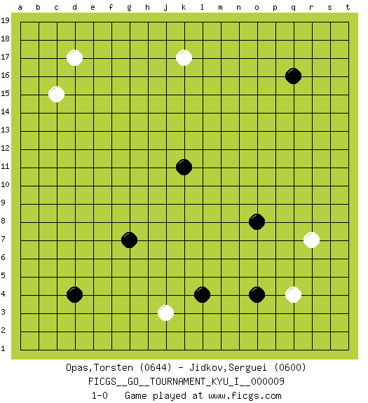 Last move : 1-0 2008 October 15 23:32:35 [Event "FICGS__GO__TOURNAMENT_KYU_I__000009"] [Site "FICGS"] [Date "2008.08.08"] [Round "1"] [Black "Opas,Torsten"] [White "Jidkov,Serguei"] [Result "1-0"] [Rating 1 "0644"] [Rating 2 "0600"] 1.q16 d17 2.d4 q4 3.o8 c15 4.k11 k17 5.o4 r7 6.g7 j3 7.l4 1-0 This go game has been lost on time (started : 2008.08.08 13:24:10) Here are the names of the openings (joseki) played in the four corners : Corner q4 : q4 o8 Hoshi (Hwajeom, Seongjeom, Xingwei`) 4-4 Point. The star or hoshi (4-4) point, emphasizing influence at the potential expense of territory. Player Black won this Go (weiqi, baduk) game. Follow this game move after move (download)The rectangular six is normally alive. (Anonymous) Chess is everything: art, science and sport. (Anatoly Karpov)