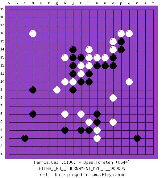 Last move : 0-1 2008 November 12 21:0:10 [Event "FICGS__GO__TOURNAMENT_KYU_I__000009"] [Site "FICGS"] [Date "2008.08.08"] [Round "1"] [Black "Harris,Cal"] [White "Opas,Torsten"] [Result "0-1"] [Rating 1 "1100"] [Rating 2 "0644"] 1.k10 d16 2.r3 q16 3.c3 o8 4.k4 k11 5.l10 j10 6.j11 g9 7.j12 l12 8.d9 h6 9.d6 l5 10.l4 m4 11.m5 k6 12.m6 m3 13.h4 o5 14.j9 h10 15.m12 m13 16.n12 l14 17.l11 k12 18.k13 l13 19.j14 h13 20.j13 n13 21.o12 q10 22.o13 o14 23.p14 o15 24.p15 p16 0-1 This go game has been lost on time (started : 2008.08.08 13:24:10) Here are the names of the openings (joseki) played in the four corners : Corner q4 : r3 o8 San-San (Sam-Sam, San-San) 3-3 Point. The San-San (3-3) point, emphasizing territory at the expense of influence. Corner d16 : d16 j11 Hoshi (Hwajeom, Seongjeom, Xingwei`) 4-4 Point. The star or hoshi (4-4) point, emphasizing influence at the potential expense of territory. Corner d4 : c3 g9 San-San (Sam-Sam, San-San) 3-3 Point. The San-San (3-3) point, emphasizing territory at the expense of influence. Player White won this Go (weiqi, baduk) game. Follow this game move after move (download)To emphasize the lack of determination in his moves, one speaks of chance. (Pierre Audouard) Wikichess, chess moves explained by 'experimented' players. (Thibault de Vassal)