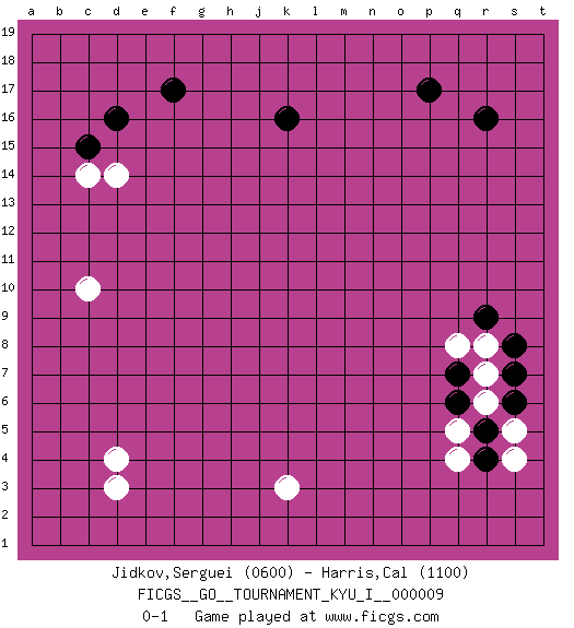 Last move : 0-1 2008 October 20 12:20:9 [Event "FICGS__GO__TOURNAMENT_KYU_I__000009"] [Site "FICGS"] [Date "2008.08.08"] [Round "1"] [Black "Jidkov,Serguei"] [White "Harris,Cal"] [Result "0-1"] [Rating 1 "0600"] [Rating 2 "1100"] 1.r16 d4 2.d16 q4 3.p17 c14 4.c15 d14 5.f17 c10 6.r9 k3 7.k16 d3 8.q6 r6 9.r5 q5 10.s6 r7 11.q7 s5 12.s7 r8 13.s8 q8 14.r4 s4 0-1 This go game has been lost on time (started : 2008.08.08 13:24:10) Here are the names of the openings (joseki) played in the four corners : Corner d16 : d16 c14 Hoshi (Hwajeom, Seongjeom, Xingwei`) 4-4 Point. The star or hoshi (4-4) point, emphasizing influence at the potential expense of territory. Ikken Kakari (Hankan Keolch'im, Yi Gua`jiao~, 1-Space Low Approach). White 2 is the standard approach move to the 4-4. Corner q4 : q4 r9 Hoshi (Hwajeom, Seongjeom, Xingwei`) 4-4 Point. The star or hoshi (4-4) point, emphasizing influence at the potential expense of territory. Player White won this Go (weiqi, baduk) game. Follow this game move after move (download)The L-group is dead. (Anonymous) I think your argument is specious - I think your tie is ugly. (Gregory House to Dr. Foreman, House M.D.)