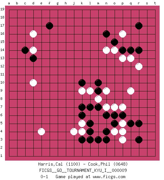 Last move : 0-1 2008 November 14 21:7:28 [Event "FICGS__GO__TOURNAMENT_KYU_I__000009"] [Site "FICGS"] [Date "2008.08.08"] [Round "1"] [Black "Harris,Cal"] [White "Cook,Phil"] [Result "0-1"] [Rating 1 "1100"] [Rating 2 "0648"] 1.k10 d16 2.r3 e4 3.r17 p16 4.f17 q9 5.r14 r12 6.n16 p3 7.k3 k4 8.m3 m4 9.n4 o4 10.l4 m5 11.n3 n5 12.l5 l6 13.o5 p5 14.o6 k5 15.l3 m6 16.k6 j4 17.k7 o7 18.p6 l9 19.m7 n7 20.n6 k9 21.q5 p4 22.r5 p7 23.l7 d10 24.c14 d14 25.d13 q13 26.q14 p13 27.p14 o14 28.o15 n14 29.m9 n9 30.m10 m8 0-1 This go game has been lost on time (started : 2008.08.08 13:24:10) Here are the names of the openings (joseki) played in the four corners : Corner q16 : r17 p16 San-San (Sam-Sam, San-San) 3-3 Point. The San-San (3-3) point, emphasizing territory at the expense of influence. Ikken Takagakari (Hankan Nop'dakeolch'im, Yi Gaokeolch'im, 1-Space High Approach). White 2 is a high tight attack with a direction bias. White continues with 4-5. Tactically, any other response is less advantageous. Corner d16 : d16 f17 Hoshi (Hwajeom, Seongjeom, Xingwei`) 4-4 Point. The star or hoshi (4-4) point, emphasizing influence at the potential expense of territory. Ikken Kakari (Hankan Keolch'im, Yi Gua`jiao~, 1-Space Low Approach). Black 2 is the standard approach move to the 4-4. Corner q4 : r3 q9 San-San (Sam-Sam, San-San) 3-3 Point. The San-San (3-3) point, emphasizing territory at the expense of influence. Player White won this Go (weiqi, baduk) game. Follow this game move after move (download)Everything happens on a grid-engraved board with black and white pieces, but if that's all you see then you don't know Go. (Pierre Audouard) The only sure thing about luck is that it will change. (Wilson Mizner)