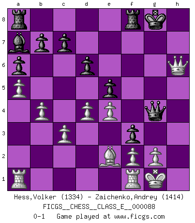 Last move : 0-1 2008 August 27 16:52:41 [Event "FICGS__CHESS__CLASS_E__000088"] [Site "FICGS"] [Date "2008.08.09"] [Round "1"] [White "Hess,Volker"] [Black "Zaichenko,Andrey"] [Result "0-1"] [WhiteElo "1334"] [BlackElo "1414"] 1.e4 e5 2.Nc3 Nc6 3.Nf3 Bc5 4.Bc4 d6 5.h3 Nf6 6.d3 O-O 7.Bg5 h6 8.Bxf6 Qxf6 9.Nd5 Qd8 10.Qd2 Ne7 11.Nxe7+ Qxe7 12.O-O Kh8 13.b4 Bb6 14.a4 a6 15.a5 Ba7 16.c3 f5 17.Nh2 f4 18.Nf3 g5 19.d4 g4 20.hxg4 Bxg4 21.Nh2 Qg5 22.Nxg4 Qxg4 23.Be2 f3 24.Qxh6+ Kg8 0-1 Vienna game, Max Lange defense Kingside Castling by player Black (move 6) Kingside Castling by player White (move 12) Player Black won this chess game. Follow this game move after move (download)I have always a slight feeling of pity for the man who has no knowledge of Chess. (Siegbert Tarrasch) Dass jemand wie Surab Asmaiparaschwili, der selbst Elopunkte gekauft hat , Vize-Präsident der Fide werden konnte, sagt schon einges über den Zustand dieser Organisation aus. (Joel Lautier) Todos los Maestros de Ajedrez fueron un día unos principiantes. (Chernev) L'ordinateur a tué l'originalité. Il n'y a plus guère d'aventures sur l'échiquier. (Jacob Murray) Perhaps chess is the wrong game for the times (The Chess Master and the Computer, by Garry Kasparov - 2010)