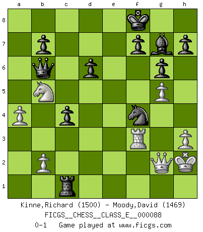 Last move : 0-1 2008 November 25 21:58:57 [Event "FICGS__CHESS__CLASS_E__000088"] [Site "FICGS"] [Date "2008.08.09"] [Round "1"] [White "Kinne,Richard"] [Black "Moody,David"] [Result "0-1"] [WhiteElo "1500"] [BlackElo "1469"] 1.d4 Nf6 2.c4 c5 3.d5 e6 4.Nc3 exd5 5.cxd5 d6 6.e4 g6 7.f4 Bg7 8.Bb5+ Nfd7 9.a4 O-O 10.Nf3 Nf6 11.O-O a6 12.e5 axb5 13.exf6 Bxf6 14.Nxb5 Na6 15.Re1 Bf5 16.Ra3 Nb4 17.Re2 Qb6 18.Ne1 Rfe8 19.Kh1 Kf8 20.h3 Nxd5 21.g4 Rxe2 22.Qxe2 Re8 23.Qd2 Be4+ 24.Ng2 c4 25.g5 Bg7 26.Qe2 Bxg2+ 27.Qxg2 Re1+ 28.Kh2 Rxc1 29.Rf3 Nxf4 0-1 Benoni : pawn storm variation Kingside Castling by player Black (move 9) Kingside Castling by player White (move 11) Player Black won this chess game. Follow this game move after move (download)Best by test: 1. e4 (Bobby Fischer) Du musst nicht gut spielen, es reicht, wenn du besser spielst als dein Gegner. (Anonymous) Vive, pierde y aprende al observar a tu oponente como gana. (Amber Steenbock) Il a essayé de se convaincre qu'il pourrait empêcher toutes les erreurs et ne jamais perdre. L'horreur ! Gary Kasparov au sujet de Robert Fischer. Animated gif is worth one mega-word. (Unknown)