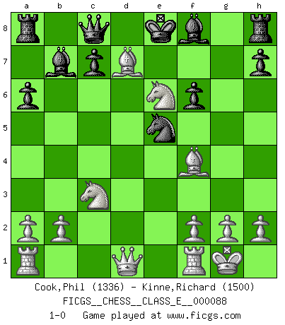 Last move : 1-0 2008 November 19 21:31:24 [Event "FICGS__CHESS__CLASS_E__000088"] [Site "FICGS"] [Date "2008.08.09"] [Round "1"] [White "Cook,Phil"] [Black "Kinne,Richard"] [Result "1-0"] [WhiteElo "1336"] [BlackElo "1500"] 1.e4 Nf6 2.e5 Nd5 3.c4 Nb6 4.Nc3 d5 5.d3 Nc6 6.c5 Nd7 7.d4 b6 8.Nxd5 bxc5 9.Nf3 e6 10.Nc3 f6 11.exf6 gxf6 12.Bb5 Bb7 13.O-O cxd4 14.Nxd4 Nce5 15.Nxe6 Qc8 16.Bf4 a6 17.Bxd7+ 1-0 This chess game has been lost on time (started : 2008.08.09 21:52:8) Alekhine's defense Kingside Castling by player White (move 13) Player White won this chess game. Follow this game move after move (download)Chess is the art of analysis. (Mikhail Botvinnik) Frage des Reporters: -Welche besonderen Umstände rechtfertigen das Anhalten der Uhren während einer Turnierpartie? Antwort: -Einen Fotographen zu strangulieren. (Siegbert Tarrasch) Cuando tengo las piezas blancas, yo gano porque soy blanco; Cuando tengo las piezas negras, yo gano porque soy Bogolyubov. (Bogolyubov) Toutes les manuvres exécutées sur une colonne ouverte ont pour but ultime l'intrusion définitive sur la septième ou la huitième rangée, en plein cur de la position ennemie. (Aaron Nimzovitch) Fame, I have already. Now I need the money. (an elderly Steinitz)