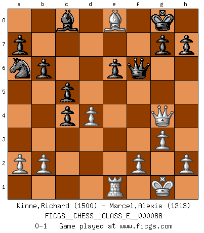 Last move : 0-1 2008 November 25 21:58:57 [Event "FICGS__CHESS__CLASS_E__000088"] [Site "FICGS"] [Date "2008.08.09"] [Round "1"] [White "Kinne,Richard"] [Black "Marcel,Alexis"] [Result "0-1"] [WhiteElo "1500"] [BlackElo "1213"] 1.d4 f5 2.c4 Nf6 3.g3 e6 4.Bg2 c6 5.Nf3 b6 6.O-O Be7 7.Nc3 Bb7 8.Qc2 O-O 9.e4 fxe4 10.Nxe4 Nxe4 11.Qxe4 Qc7 12.Qg4 Na6 13.Bh6 Bf6 14.Nd2 Rae8 15.Rae1 Bc8 16.Re3 d5 17.Bf4 Qd7 18.Nf3 Re7 19.Rfe1 Rfe8 20.Ng5 Bxg5 21.Bxg5 Rf7 22.Rf3 Rxf3 23.Bxf3 dxc4 24.Bf6 c5 25.Bc6 Qf7 26.Bxe8 Qxf6 0-1 Dutch defense Kingside Castling by player White (move 6) Kingside Castling by player Black (move 8) Player Black won this chess game. Follow this game move after move (download)When your house is on fire, you can't be bothered with the neighbors. Or, as we say in Chess, if your King is under attack you don't worry about losing a Pawn on the Queen's side. (Gary Kasparov) Auf Remis zu spielen ist gewissermaßen ein Verbrechen gegen das Schachspiel. (Mikhail Nekhemyevich Tal) Solo puedes ser bueno en el Ajedrez si amas al juego. (Bobby Fischer) Il n'y a pas de prix trop élevé au scalp de l'ennemi. (Koblentz) When I took office, only high energy physicists had ever heard of what is called the World Wide Web... Now even my cat has its own page. (Bill Clinton, 1996)