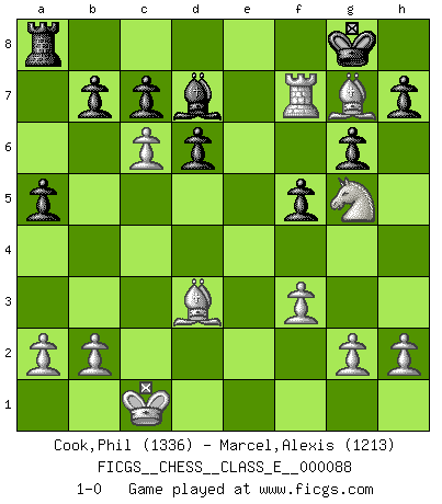 Last move : 1-0 2008 August 29 8:57:52 [Event "FICGS__CHESS__CLASS_E__000088"] [Site "FICGS"] [Date "2008.08.09"] [Round "1"] [White "Cook,Phil"] [Black "Marcel,Alexis"] [Result "1-0"] [WhiteElo "1336"] [BlackElo "1213"] 1.e4 e5 2.Nf3 Nf6 3.Nc3 Bb4 4.Nd5 Nxd5 5.exd5 d6 6.c3 Bc5 7.d4 exd4 8.Qe2+ Qe7 9.Qxe7+ Kxe7 10.cxd4 Bb6 11.Bd2 Re8 12.O-O-O Kf8 13.Bd3 Kg8 14.Rde1 Rxe1+ 15.Rxe1 g6 16.Bh6 f5 17.Ng5 Bd7 18.Re7 Bxd4 19.f3 a5 20.Rf7 Bg7 21.Bxg7 Nc6 22.dxc6 1-0 Petrov Three knights game Queenside Castling by player White (move 12) Player White won this chess game. Follow this game move after move (download)The Pawns are the soul of the game. (Francois Andre Danican Philidor) Ich rechne überhaupt nicht voraus. Ich gewinne auch so. (Robert James Fischer) De todos mis libros Rusos, la defensa contiene y difunde el 'calor' mas grande que pudiese verse extraño al observar lo supremamente abstracto que el Ajedrez supuestamente es. (Vladimir Nabokov) Un footballeur joue avec ses pieds, parfois avec sa tête. Un joueur d'échecs ne joue qu'avec sa tête. Et quand il ne joue plus, il meurt. (Jacob Murray) Over-the-board chess is the favorite of mortals, correspondence chess is the favorite of the gods. (Eduard Dyckhoff)