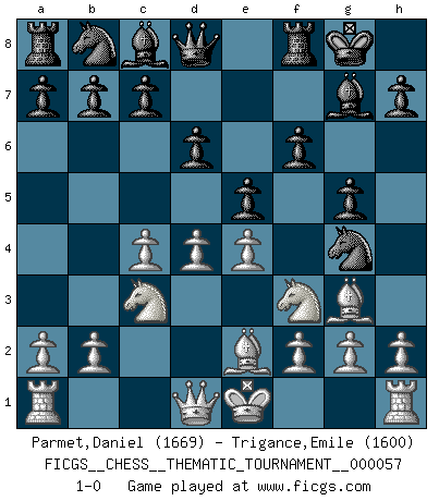 Last move : 1-0 2008 October 14 11:23:30 [Event "FICGS__CHESS__THEMATIC_TOURNAMENT__000057"] [Site "FICGS"] [Date "2008.08.11"] [Round "1"] [White "Parmet,Daniel"] [Black "Trigance,Emile"] [Result "1-0"] [WhiteElo "1669"] [BlackElo "1600"] 1.d4 Nf6 2.c4 g6 3.Nc3 Bg7 4.e4 d6 5.Be2 O-O 6.Nf3 e5 7.Be3 Ng4 8.Bg5 f6 9.Bh4 g5 10.Bg3 1-0 This chess game has been lost on time (started : 2008.08.11 21:59:19) King's Indian : 5.Be2 Kingside Castling by player Black (move 5) Player White won this chess game. Follow this game move after move (download)After black's reply to 1.e4 with 1..e5, leaves him always trying to get into the game. (Howard Staunton) Das typische an einem Großmeister ist, daß er eine gewonnene Position schnell und schmerzlos gewinnt. (Irving Chernev) Antes de los Finales, los dioses han colocado el Juego Medio. (Siegbert Tarrasch) On entre au jeu d'Echecs comme on entre en Religion. Pour le joueur d'Echecs, la partie d'Echecs c'est l'office, la messe, le défilé du 1er Mai, le dépôt de gerbe au Monument aux Morts. C'est un drame sacré. (Michel Roos) Computers are like Old Testament gods; lots of rules and no mercy. (Joseph Campbell)