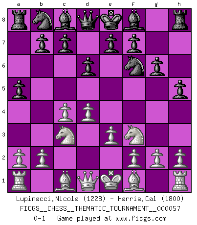 Last move : 0-1 2008 September 27 22:29:4 [Event "FICGS__CHESS__THEMATIC_TOURNAMENT__000057"] [Site "FICGS"] [Date "2008.08.11"] [Round "1"] [White "Lupinacci,Nicola"] [Black "Harris,Cal"] [Result "0-1"] [WhiteElo "1228"] [BlackElo "1800"] 1.d4 Nf6 2.c4 g6 3.Nc3 d6 4.Nf3 h5 5.e3 a5 0-1 This chess game has been lost on time (started : 2008.08.11 21:59:19) King's Indian defense, 3.Nc3 Player Black won this chess game. Follow this game move after move (download)My opponents make good moves too. Sometimes I don't take these things into consideration. (Bobby Fischer) Es gibt keine einzige Frau, der ich nicht einen Springer vorgeben könnte und trotzdem gewänne. (Robert James Fischer) El Ajedrez es la vida. (Bobby Fischer) J'apprécie les joueurs d'est-indienne, c'est grâce à eux que je nourris ma famille depuis tant d'années. (Petrosian) Men never do evil so completely and cheerfully as when they do it from religious conviction. (Blaise Pascal)