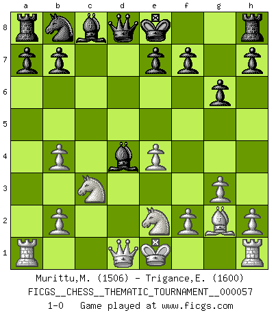 Last move : 1-0 2008 November 14 9:5:12 [Event "FICGS__CHESS__THEMATIC_TOURNAMENT__000057"] [Site "FICGS"] [Date "2008.08.11"] [Round "1"] [White "Murittu,Massimiliano"] [Black "Trigance,Emile"] [Result "1-0"] [WhiteElo "1506"] [BlackElo "1600"] 1.d4 Nf6 2.c4 g6 3.g3 d5 4.Bg2 Bg7 5.cxd5 Nxd5 6.e4 Nb4 7.d5 c6 8.a3 Qa5 9.Nc3 cxd5 10.Be3 d4 11.axb4 Qd8 12.Bxd4 Bxd4 13.Nge2 1-0 King's Indian : 3.g3 Player White won this chess game. Follow this game move after move (download)A thorough understanding of the typical mating continuations makes the most complicated sacrificial combinations leading up to them not only not difficult, but almost a matter of course. (Siegbert Tarrasch) Gewinnen beim Schach fördert das Selbstvertrauen. Beim Sex spüre ich sowas nicht... (Garry Kasparov) Solo puedes ser bueno en el Ajedrez si amas al juego. (Bobby Fischer) La conception d'un plan est le processus par lequel un joueur exploite les avantages de sa position tout en s'efforçant d'en réduire au minimum les inconvénients. Afin de garantir le succès, un plan doit toujours se fonder sur un diagnostic objectif des particularités d'une position. La conception d'un plan est d'autant plus difficile que la position est équilibrée, et grandement facilitée lorsqu'il n'existe qu'un seul plan susceptible de répondre aux exigences de la position. (Harry Golombek) The real danger is not that computers will begin to think like men, but that men will begin to think like computers. (Sydney J. Harris)