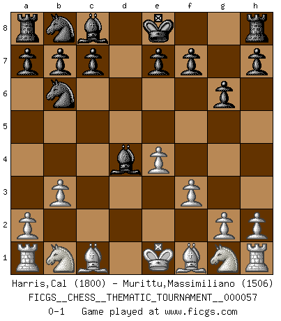 Last move : 0-1 2008 August 20 16:36:41 [Event "FICGS__CHESS__THEMATIC_TOURNAMENT__000057"] [Site "FICGS"] [Date "2008.08.11"] [Round "1"] [White "Harris,Cal"] [Black "Murittu,Massimiliano"] [Result "0-1"] [WhiteElo "1800"] [BlackElo "1506"] 1.d4 Nf6 2.c4 g6 3.f3 d5 4.cxd5 Nxd5 5.e4 Nb6 6.b3 Bg7 7.Qd3 Qxd4 8.Qxd4 Bxd4 0-1 King's Indian defense Player Black won this chess game. Follow this game move after move (download)He who fears an isolated Queen's Pawn should give up Chess. (Siegbert Tarrasch) Es tut gut, die Entwicklungsperiode von, [...] demokratischem Geist durchdringen zu lassen. Wie undemokratisch wäre es doch beispielsweise, den einen Offizier große Spaziertouren vornehmen zu lassen, während die anderen zu Hause säßen und sich entsetzlich langweilten. (Aaron Nimzowitsch) Aún el Rey más flojo huye despavorido ante la amenaza de un Jaque doble. (Aaron Nimzowitsch) Le moment que je préfère le plus dans une rencontre, c'est celui où je sens que la personnalité de l'adversaire se brise. (Robert Fischer) Empty your mind, be formless, shapeless — like water. (Bruce Lee)