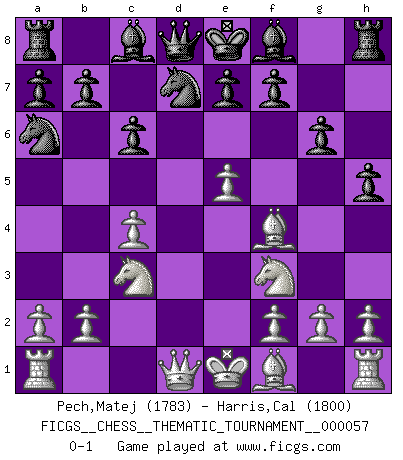 Last move : 0-1 2008 September 24 2:26:14 [Event "FICGS__CHESS__THEMATIC_TOURNAMENT__000057"] [Site "FICGS"] [Date "2008.08.11"] [Round "1"] [White "Pech,Matej"] [Black "Harris,Cal"] [Result "0-1"] [WhiteElo "1783"] [BlackElo "1800"] 1.d4 Nf6 2.c4 g6 3.Nc3 d6 4.e4 Na6 5.Nf3 h5 6.Bf4 c6 7.e5 dxe5 8.dxe5 Nd7 0-1 This chess game has been lost on time (started : 2008.08.11 21:59:19) King's Indian defense, 3.Nc3 Player Black won this chess game. Follow this game move after move (download)It's always better to sacrifice your opponent's men. (Savielly Tartakover) Mutter, ich bin eben Ex-Weltmeister geworden. --beim nach Hause Kommen nach dem Verlust des WM-Titels an Mihail Botvinnik -- (Mikhail Nekhemyevich Tal) El Ajedrez es parte de la cultura, y si una cultura esta en decadencia, entonces también el Ajedrez declinará. (Mikhail Botvinnik) Psychologiquement, tu dois avoir confiance en toi même, mais cette confiance doit être basée sur des faits. (Robert Fischer) I don't know, I don't care, and it doesn't make any difference. (Albert Einstein)