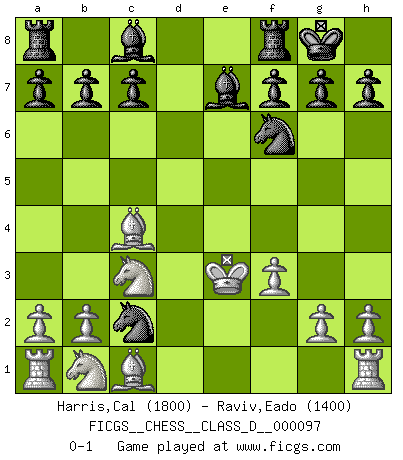 Last move : 0-1 2009 January 7 17:40:29 [Event "FICGS__CHESS__CLASS_D__000097"] [Site "FICGS"] [Date "2008.08.11"] [Round "1"] [White "Harris,Cal"] [Black "Raviv,Eado"] [Result "0-1"] [WhiteElo "1800"] [BlackElo "1400"] 1.e4 d5 2.exd5 Qxd5 3.Ne2 e5 4.f3 Nf6 5.Nec3 Qc5 6.Na4 Qb4 7.c3 Qe7 8.d4 exd4 9.Kf2 Qd7 10.cxd4 Be7 11.Nac3 O-O 12.Bc4 Nc6 13.Qd3 Qxd4+ 14.Qxd4 Nxd4 15.Ke3 Nc2+ 0-1 Scandinavian (centre counter) defense Kingside Castling by player Black (move 11) Player Black won this chess game. Follow this game move after move (download)Not all artists are Chess players, but all Chess players are artists. (Marcel Duchamp) Korrekt heißt in Deutschland die Haltung eines Mannes, dessen Benehmen nach dem Urteile seiner Nachbarn seiner Stellung angemessen ist. Um korrekt zu sein, muß man sich der Meinung der anderen anpassen... (Emanuel Lasker) Un Peón pasado es un criminal, quién debe ser mantenido bajo candado y llave. Leves medidas, tales como vigilancia policiaca, no son suficientes. (Aaron Nimzovich) Nous sommes les pions de la mystérieuse partie d'Echecs jouée par Dieu. Il nous déplace, nous arrête, nous pousse encore, puis nous lance un à un dans la boîte du Néant. Epitaphe sur la tombe de David Janowsky (1868-1927). I have opinions of my own - strong opinions - but I don't always agree with them. (George Bush)