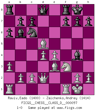 Last move : 1-0 2008 November 28 10:22:3 [Event "FICGS__CHESS__CLASS_D__000097"] [Site "FICGS"] [Date "2008.08.11"] [Round "1"] [White "Raviv,Eado"] [Black "Zaichenko,Andrey"] [Result "1-0"] [WhiteElo "1400"] [BlackElo "1414"] 1.e4 e5 2.Nc3 Bc5 3.f4 exf4 4.Nf3 d6 5.d4 Bb6 6.Bxf4 Bg4 7.a3 Ne7 8.Bc4 O-O 9.Be3 Nbc6 10.Qd2 a6 11.O-O d5 12.Nxd5 Nxd5 13.Bxd5 1-0 Vienna game Kingside Castling by player Black (move 8) Kingside Castling by player White (move 11) Player White won this chess game. Follow this game move after move (download)One of these modest little moves may be more embarrassing to your opponent than the biggest threat. (Siegbert Tarrasch) Ein guter Spieler hat immer Glück. (José Raúl Capablanca) Cuando le juegas a Fischer, no es una cuestion de si vas a ganar o perder. Es una cuestion de si vas a sobrevivir. (Boris Spassky) Je crois qu'il existe des manières très spécifiques de jouer efficacement contre une machine. Evidemment, nous n'avons aucune chance en technique pure, parce que l'ordinateur calcule de manière parfaite. Mais lorsque nous faisons appel à notre cerveau, en utilisant l'intuition et la compréhension, alors nous restons beaucoup plus forts. (Anatoli Karpov) Statistics can be made to prove anything - even the truth. (Author unknown)