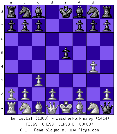 Last move : 0-1 2008 August 12 23:21:50 [Event "FICGS__CHESS__CLASS_D__000097"] [Site "FICGS"] [Date "2008.08.11"] [Round "1"] [White "Harris,Cal"] [Black "Zaichenko,Andrey"] [Result "0-1"] [WhiteElo "1800"] [BlackElo "1414"] 1.e4 e5 2.g4 d5 3.exd5 Qxd5 4.c3 Qxh1 0-1 King's pawn game Player Black won this chess game. Follow this game move after move (download)Not only will I predict his triumph over Botvinnik, but I'll go further and say that he'll probably be the greatest Chess player that ever lived. (John Collins) Jeder leidlich begabte Spieler, er braucht keineswegs hervorragend veranlagt zu sein, kann es zum Meister bringen. Aber das ist ja auch gar nicht nötig! Der richtige Standpunkt ist es, zu seinem Vergnügen zu spielen, und man glaube ja nicht, dass der Genuss proportional dem Können sei. (Siegbert Tarrasch) El Ajedrez era la lengua materna de Capablanca. (Reti) Le moment que je préfère le plus dans une rencontre, c'est celui où je sens que la personnalité de l'adversaire se brise. (Robert Fischer) The meaning of life is that it is to be lived, and it is not to be traded and conceptualized and squeezed into a pattern of systems. (Bruce Lee)