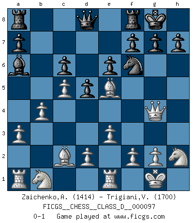 Last move : 0-1 2008 November 16 21:14:59 [Event "FICGS__CHESS__CLASS_D__000097"] [Site "FICGS"] [Date "2008.08.11"] [Round "1"] [White "Zaichenko,Andrey"] [Black "Trigiani,Vincenzo"] [Result "0-1"] [WhiteElo "1414"] [BlackElo "1700"] 1.b4 b5 2.Bb2 Bb7 3.e3 Nf6 4.Nf3 d5 5.Bxb5+ c6 6.Ba4 Nbd7 7.O-O e6 8.a3 Bd6 9.Bb3 O-O 10.c4 Nb6 11.c5 Bxh2+ 12.Nxh2 Nbd7 13.Bc2 Ba6 14.Re1 Ne5 15.Bxe5 Ne4 16.Qg4 Nf6 0-1 Polish (Sokolsky) opening Kingside Castling by player White (move 7) Kingside Castling by player Black (move 9) Player Black won this chess game. Follow this game move after move (download)If cunning alone were needed to excel, women would be the best Chess players. (Albin) Es gibt nur zwei wahre Schachgenies - das andere war Wilhelm Steinitz, der Weltmeister von 1872 bis 1894. (Robert James Fischer) El juego del Ajedrez no es solamente una diversión quieta; algunas cualidades muy valuables de la mente se pueden adquirir y cultivar con el, como convertirlos en habitos disponibles para toda ocasión; ya que la vida es algo así como el Ajedrez. (Benjamin Franklin) Le pion, dans sa simplicité, marche droit devant lui, mais lorsqu'il prend, il le fait obliquement? Ainsi l'homme, tant qu'il reste pauvre, marche dans la droiture et vit honnêtement, mais lorsqu'il recherche les honneurs, il flatte, se parjure et, par les voies obliques, cherche une position supérieure sur l'échiquier du monde. (Jean de Galles) I take risks, sometimes patients die, but not taking risks causes more patients to die. So I guess my biggest problem is I've been cursed with the ability to do the math. (Gregory House, House M.D.)