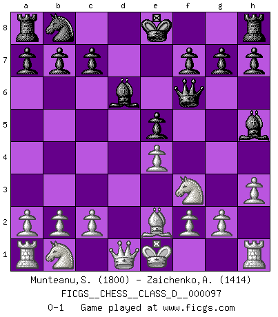 Last move : 0-1 2008 October 8 23:1:7 [Event "FICGS__CHESS__CLASS_D__000097"] [Site "FICGS"] [Date "2008.08.11"] [Round "1"] [White "Munteanu,Sergiu"] [Black "Zaichenko,Andrey"] [Result "0-1"] [WhiteElo "1800"] [BlackElo "1414"] 1.e4 e5 2.Nf3 Nf6 3.d3 d5 4.Bg5 dxe4 5.Bxf6 Qxf6 6.dxe4 Bg4 7.Be2 Bd6 8.h3 Bh5 0-1 This chess game has been lost on time (started : 2008.08.11 22:0:21) Petrov's defense Player Black won this chess game. Follow this game move after move (download)You need not play well - just help your opponent to play badly. (Genrikh Chepukaitis) Ich verachte Kasparow. (Viktor Kortschnoi) Un Peón pasado es un criminal, quién debe ser mantenido bajo candado y llave. Leves medidas, tales como vigilancia policiaca, no son suficientes. (Aaron Nimzovich) Les Echecs représentent une sphère d'idées créatrices basée sur la volonté des deux protagonistes. (Smyslov) Lottery : A tax on people who are bad at math. (Author unknown)