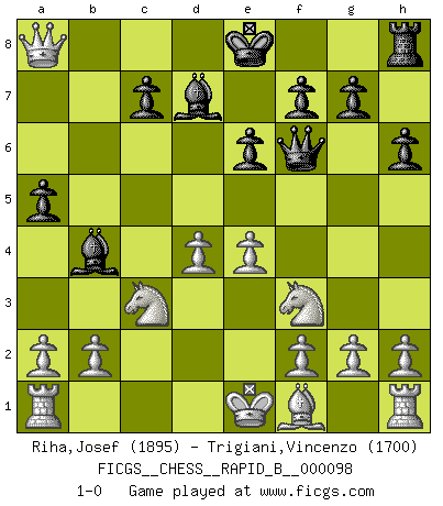 Last move : 1-0 2008 August 15 9:46:5 [Event "FICGS__CHESS__RAPID_B__000098"] [Site "FICGS"] [Date "2008.08.13"] [Round "1"] [White "Riha,Josef"] [Black "Trigiani,Vincenzo"] [Result "1-0"] [WhiteElo "1895"] [BlackElo "1700"] 1.d4 d5 2.c4 e6 3.Nc3 Nc6 4.Nf3 Nf6 5.Bg5 Bd6 6.cxd5 Bb4 7.dxc6 bxc6 8.e4 h6 9.Bxf6 Qxf6 10.Qa4 a5 11.Qxc6+ Bd7 12.Qxa8+ 1-0 QGD : 3.Nc3 Player White won this chess game. Follow this game move after move (download)If your opponent offers you a draw, try to work out why he thinks he's worse off. (Nigel Short) Als er Schachweltmeister wurde ließ er praktisch alle stärksten Sovietspieler für sich arbeiten. Wenn ein auch nur mittelmässiger Meister ein Spezialist für eine bestimmte Eröffnung war, wurde er von Karpov gerufen. Das wurde alles geheim gehalten. (Mikhail Moiseyevich Botvinik) Cuando tu casa esta en llamas, no puedes ser molestado por tus vecinos. O, como decinos en Ajedrez, si tu Rey esta bajo ataque, no te preocupa perder un Peón del lado de la Reina. (Gary Kasparov) Nous sommes les pions de la mystérieuse partie d'Echecs jouée par Dieu. Il nous déplace, nous arrête, nous pousse encore, puis nous lance un à un dans la boîte du Néant. Epitaphe sur la tombe de David Janowsky (1868-1927). Hardware: the parts of a computer that can be kicked. (Jeff Persis)