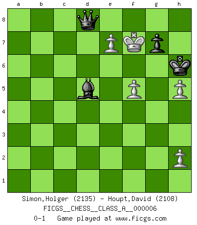 Last move : 0-1 2007 August 2 19:54:32 [Event "FICGS__CHESS__CLASS_A__000006"] [Site "FICGS"] [Date "2006.08.01"] [Round "1"] [White "Simon,Holger"] [Black "Houpt,David"] [Result "0-1"] [WhiteElo "2135"] [BlackElo "2108"] 1.d4 Nf6 2.c4 e6 3.Nc3 Bb4 4.Qc2 d5 5.a3 Bxc3+ 6.Qxc3 Nc6 7.Nf3 Ne4 8.Qc2 e5 9.dxe5 Bf5 10.Qb3 Na5 11.Qa4+ c6 12.cxd5 Qxd5 13.Be3 Nc4 14.Rd1 Nxb2 15.Rxd5 Nxa4 16.Ra5 Nb2 17.Rxa7 O-O 18.Nd2 Nxd2 19.Rxa8 Rxa8 20.Bxd2 Rxa3 21.f3 Be6 22.Kf2 Nc4 23.Bf4 Ra2 24.g3 b5 25.Bg2 b4 26.Rd1 h5 27.Rd8 Kh7 28.Rb8 c5 29.g4 Nb2 30.Kg3 b3 31.gxh5 Na4 32.Bc1 Nc3 33.Bf1 c4 34.e4 Ne2+ 35.Bxe2 Rxe2 36.Ba3 c3 37.Bb4 c2 38.Ba3 Re1 39.Rb7 Ra1 40.Bb2 Rb1 41.Ba3 b2 42.Bxb2 Rxb2 43.Rxb2 c1Q 44.Rg2 Qe1+ 45.Rf2 Bh3 46.f4 Qe3+ 47.Rf3 Qe2 48.f5 Kh6 49.Kf4 Bg2 50.e6 Qxf3+ 51.Ke5 Qxe4+ 52.Kd6 Qc6+ 53.Ke7 Qc7+ 54.Kf8 Qd8+ 55.Kxf7 Bc6 56.e7 Bd5+ 0-1 This chess game has been lost on time (started : 2006.08.01 16:32:54) Nimzo-Indian : Classical, Botvinnik variation Kingside Castling by player Black (move 17) Promotion Queen by player Black (move 43) 10 pieces endgame at move 51 : White KPPPP , Black KQBPP WHITE : King + 4 Pawns BLACK : King + 1 Queen 1 Bishop 2 Pawns 9 pieces endgame at move 55 : White KPPPP , Black KQBP WHITE : King + 4 Pawns BLACK : King + 1 Queen 1 Bishop 1 Pawn Player Black won this chess game. Follow this game move after move (download)In Chess, at least, the brave inherit the earth. (Edmar Mednis) Ein bischen Romantik kann weder im Schach noch in der Liebe schaden. Also versuche ich mich ab und zu daran zu erinnern. (Nigel Short) Aquellos que dicen que entienden al Ajedrez, no entienden nada. (Robert Hubner) Ce qui caractérise les parties de combat, c'est que si le défenseur a constamment de difficiles problèmes à résoudre, l'attaquant doit chercher sans relâche de nouvelles possibilités d'attaque. (Koblentz) The various flowers seem good to different people. (Chinese proverb)