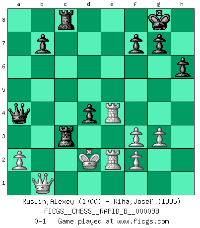 Last move : 0-1 2008 August 23 18:36:14 [Event "FICGS__CHESS__RAPID_B__000098"] [Site "FICGS"] [Date "2008.08.13"] [Round "1"] [White "Ruslin,Alexey"] [Black "Riha,Josef"] [Result "0-1"] [WhiteElo "1700"] [BlackElo "1895"] 1.d4 Nf6 2.Nf3 e6 3.Bf4 d5 4.e3 Bd6 5.Bg3 O-O 6.Bd3 c5 7.c3 Nc6 8.Qc2 Re8 9.Nbd2 e5 10.dxe5 Nxe5 11.Nxe5 Bxe5 12.Nf3 Bxg3 13.hxg3 h6 14.O-O-O Qa5 15.Qb1 Bg4 16.Rde1 d4 17.exd4 Bxf3 18.gxf3 cxd4 19.b4 Qd5 20.Be4 Nxe4 21.Rxe4 Rec8 22.Rhe1 a5 23.bxa5 Qxa5 24.R1e2 Rxc3+ 25.Kd1 Qa4+ 26.Kd2 Rac8 0-1 Queen's pawn game Kingside Castling by player Black (move 5) Queenside Castling by player White (move 14) Player Black won this chess game. Follow this game move after move (download)Life is like a game of Chess, changing with each move. (Chinese proverb) Schach ist ein Reich, wo sich die menschliche Phantasie frei entfalten kann. (David Bronstein) El Ajedrez, como la música, como el amor, tiene el poder de hacer feliz a la gente. (Siegbert Tarrasch) Comme les marins qui ont mille raisons différentes d'aller en mer, les joueurs d'échecs en ont tout autant avant de s'installer devant une table et jouer... (Vincent Bertignac, philosophe) He who fights with monsters should be careful lest he thereby become a monster. (Friedrich Nietzsche, Beyond Good and Evil)