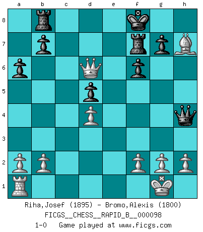 Last move : 1-0 2008 August 24 11:20:19 [Event "FICGS__CHESS__RAPID_B__000098"] [Site "FICGS"] [Date "2008.08.13"] [Round "1"] [White "Riha,Josef"] [Black "Bromo,Alexis"] [Result "1-0"] [WhiteElo "1895"] [BlackElo "1800"] 1.d4 d5 2.c4 c6 3.Nf3 f6 4.e3 Nd7 5.cxd5 cxd5 6.Nc3 e6 7.Bd3 Bd6 8.e4 Ne7 9.O-O O-O 10.Re1 a6 11.exd5 exd5 12.Qb3 Nb6 13.Ne4 Be6 14.Nxd6 Qxd6 15.Bf4 Qxf4 16.Rxe6 Nec8 17.Rxb6 Nxb6 18.Qxb6 Rab8 19.Qe6+ Rf7 20.Bxh7+ Kf8 21.Nh4 Qxh4 22.Qd6+ 1-0 QGD Slav : 3.Nf3 Kingside Castling by player White (move 9) Kingside Castling by player Black (move 9) Player White won this chess game. Follow this game move after move (download)I had a toothache during the first game. In the second game I had a headache. In the third game it was an attack of rheumatism. In the fourth game, I wasn't feeling well. And in the fifth game? Well, must one have to win every game ? (Siegbert Tarrasch) Wenn Du absolut nicht mehr weißt, was Du tun sollst, dann ist es Zeit für Panik. (John van der Wiel) Hoy en día, si tu no eres un Gran Maestro a los 14 años, es mejor que lo olvides. (Anand Viswanathan) C'est une question de caractère, Beaucoup de gens perdent leur motivation très vite. D'autres, ils sont rares, peuvent la conserver très longtemps. J'aime les échecs, encore aujourd'hui je suis heureux d'analyser des parties. J'aime toujours gagner, je déteste encore perdre. Bien jouer est important pour mon intégrité intellectuelle et morale. Et puis les échecs vivent en ce moment une période historique grâce à Internet. Ils se développent dans les systèmes éducatifs à travers le monde. Ils sortent de leur ghetto, et c'est mon rôle de mener à bien cette révolution. (Gary Kasparov) Life is pleasant. Death is peaceful. It's the transition that's troublesome. (Isaac Asimov)