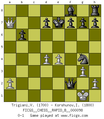 Last move : 0-1 2008 August 26 17:6:52 [Event "FICGS__CHESS__RAPID_B__000098"] [Site "FICGS"] [Date "2008.08.13"] [Round "1"] [White "Trigiani,Vincenzo"] [Black "Korshunov,Igor"] [Result "0-1"] [WhiteElo "1700"] [BlackElo "1800"] 1.d4 Nf6 2.Bf4 c5 3.Nf3 cxd4 4.Nxd4 e5 5.Bxe5 Qa5+ 6.c3 Qxe5 7.e3 Nc6 8.Bb5 Nxd4 9.cxd4 Qxb5 10.Nc3 Qxb2 11.O-O Qxc3 12.Rc1 Qa5 13.Rc2 b6 14.g3 Ba6 15.e4 Bxf1 16.Kxf1 Qa6+ 17.Kg1 Rc8 18.Re2 Rc1 19.Qxc1 Qxe2 20.Qc8+ Ke7 21.Qb7 Ng4 22.Qxa7 Qxf2+ 0-1 Queen's pawn game Kingside Castling by player White (move 11) Player Black won this chess game. Follow this game move after move (download)A bad day of Chess is better than any good day at work. (Anonymous) Das Schachspiel hat wie die Liebe, die Musik, die Fähigkeit, den Menschen glücklich zu machen. Ich habe ein leises Gefühl des Bedauerns für jeden, der das Schachspiel nicht kennt, so wie ich jeden bedaure, der die Liebe nicht kennt. (Siegbert Tarrasch) ¿Quién es tu oponente esta tarde? Esta tarde mi oponente son las piezas negras. (Akiba Rubinstein) Les échecs sont utiles à l'exercice de la faculté de penser et à celle de l'imagination. Car nous devons posséder une méthode élaborée pour atteindre des buts partout où nous devons conduire notre raison. (Leibnitz) A specialist learns more and more about less and less until he knows everything about nothing. (Nicholas Murray Butler)
