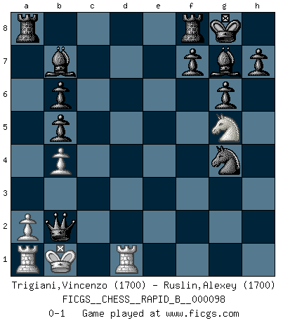Last move : 0-1 2008 August 28 17:48:40 [Event "FICGS__CHESS__RAPID_B__000098"] [Site "FICGS"] [Date "2008.08.13"] [Round "1"] [White "Trigiani,Vincenzo"] [Black "Ruslin,Alexey"] [Result "0-1"] [WhiteElo "1700"] [BlackElo "1700"] 1.d4 Nf6 2.Bf4 b6 3.Nc3 Bb7 4.Nb5 d6 5.c3 g6 6.Nxc7+ Qxc7 7.Nf3 Nbd7 8.e3 Bg7 9.Bb5 O-O 10.b4 a6 11.O-O axb5 12.Ng5 Nh5 13.Qg4 Nxf4 14.Qxf4 e5 15.Qg4 Nf6 16.dxe5 Nxg4 17.exd6 Qxd6 18.Rfd1 Qxh2+ 19.Kf1 Qxg2+ 20.Ke2 Qxf2+ 21.Kd3 Qxe3+ 22.Kc2 Qxc3+ 23.Kb1 Qb2+ 0-1 Queen's pawn game Kingside Castling by player Black (move 9) Kingside Castling by player White (move 11) Player Black won this chess game. Follow this game move after move (download)Suddenly it was obvious to me in my analysis I had missed what Fischer had found with the greatest of ease at the board. (Mikhail Botvinnik) Intelligenz läßt sich nicht am Weg, sondern nur am Ergebnis feststellen. (Garry Kasparov) Una victoria por una combinación errónea, aunque sea espectacular, me llena de horror artístico. (Wilhelm Steinitz) Tout change constamment, y compris dans le monde des Echecs. (Botvinnik) Perhaps the current trend of many chess professionals taking up the more lucrative pastime of poker is not a wholly negative one. It may not be too late for humans to relearn how to take risks in order to innovate and thereby maintain the advanced lifestyles we enjoy. And if it takes a poker-playing supercomputer to remind us that we can't enjoy the rewards without taking the risks, so be it. (The Chess Master and the Computer, by Garry Kasparov - 2010)