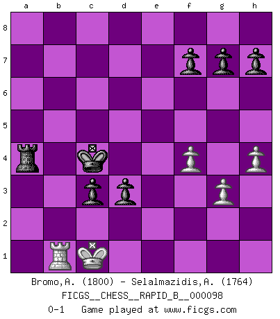 Last move : 0-1 2008 August 26 10:6:8 [Event "FICGS__CHESS__RAPID_B__000098"] [Site "FICGS"] [Date "2008.08.13"] [Round "1"] [White "Bromo,Alexis"] [Black "Selalmazidis,Arsenis"] [Result "0-1"] [WhiteElo "1800"] [BlackElo "1764"] 1.d4 d5 2.e3 Nf6 3.c4 e6 4.c5 b6 5.b4 a5 6.Bd2 axb4 7.Bxb4 Nc6 8.Bb5 Bd7 9.Bxc6 Bxc6 10.Ne2 bxc5 11.Bxc5 Bxc5 12.dxc5 Qe7 13.Qd4 Ra5 14.Nd2 Qxc5 15.Qxc5 Rxc5 16.Nb3 Rb5 17.Ned4 Rb6 18.Rc1 Kd7 19.Nxc6 Rxc6 20.Rxc6 Kxc6 21.Nd4+ Kd6 22.Ke2 c5 23.Nb5+ Kc6 24.a4 Ra8 25.Ra1 Ne4 26.f3 Nd6 27.Nxd6 Kxd6 28.Kd3 c4+ 29.Kd4 e5+ 30.Kc3 Kc5 31.g3 Ra5 32.h4 d4+ 33.exd4+ exd4+ 34.Kb2 Kb4 35.Rd1 d3 36.f4 Rxa4 37.Rb1 c3+ 38.Kc1 Kc4 0-1 Queen's pawn game Player Black won this chess game. Follow this game move after move (download)Chess is above all, a fight ! (Emanuel Lasker) Man kann eine Schachpartie nur gewinnen, wenn das Gleichgewicht gestört ist. In einer Stellung mit ungestörtem Gleichgewicht ist auch das größte Genie hilflos - in der Stellung steckt dann eben kein genialer Einfall. (Wilhelm Steinitz) Todavía soy una víctima del Ajedrez. Tiene toda la belleza del arte y mucho mas. No puede ser comercializado. El Ajedrez es mas puro que el arte en su posición social. (Marcel Duchamp) Même un GMI sait rarement calculer sur plus de cinq coups une attaque à sacrifices. (Rudolf Spielmann) Real knowledge is to know the extent of one's ignorance. (Confucius)
