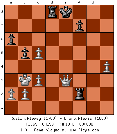 Last move : 1-0 2008 August 29 8:18:19 [Event "FICGS__CHESS__RAPID_B__000098"] [Site "FICGS"] [Date "2008.08.13"] [Round "1"] [White "Ruslin,Alexey"] [Black "Bromo,Alexis"] [Result "1-0"] [WhiteElo "1700"] [BlackElo "1800"] 1.d4 d5 2.Nf3 Nf6 3.Bf4 Nc6 4.c3 e6 5.Nbd2 h6 6.h3 Bd6 7.Bh2 Bxh2 8.Nxh2 O-O 9.e3 e5 10.dxe5 Nxe5 11.Nhf3 Nxf3+ 12.Qxf3 a6 13.Bd3 Re8 14.O-O-O b5 15.g4 c5 16.g5 hxg5 17.Rdg1 Rb8 18.Rxg5 d4 19.exd4 Bb7 20.Qg3 Bxh1 21.Rxg7+ Kf8 22.dxc5 Be4 23.Bxe4 Nxe4 24.Nxe4 Rxe4 25.Rg8+ Ke7 26.Rxd8 Rxd8 27.Qg5+ Ke8 28.h4 Re1+ 29.Kc2 Re2+ 30.Kb3 Rxf2 31.Qe3+ 1-0 Queen's Bishop game Kingside Castling by player Black (move 8) Queenside Castling by player White (move 14) Player White won this chess game. Follow this game move after move (download)The older I grow, the more I value pawns. (Paul Keres) Um dein Spiel zu verbessern musst du zuallererst das Endspiel studieren, denn diese kann unabhängig studiert werden. Die Eröffnung und das Mittelspiel müssen immer in Bezug gesetzt werden zum Endspiel. (José Raúl Capablanca) Ciertamente el estado mental actual de Bobby Fischer es una tragedia. Uno de los mas grandes jugadores de Ajedrez del mundo -el orgullo y pena del Ajedrez Americano. (Frank Brady) Botvinnik disait en comparant les échecs à la musique: Il existe une science dont le but est l'étude de l'acoustique et des sons. Mais il y a aussi un art qui se sert de l'océan des sons : c'est la musique. De toute évidence, il en est de même pour la pensée. La logique est l'étude des lois de la réflexion et les échecs reflètent, en tant qu'art, le côté logique de la réflexion, sous la forme d'images artistiques... Extrait de Fischer - Spassky, Reykjavik 1972 par Alexander & F. Wyndham (Ed. Solar), p 37. It's not a bug - it's an undocumented feature. (Anonymous)