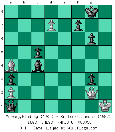 Last move : 0-1 2008 November 2 0:45:56 [Event "FICGS__CHESS__RAPID_C__000056"] [Site "FICGS"] [Date "2008.08.14"] [Round "1"] [White "Murray,Findlay"] [Black "Kepinski,Janusz"] [Result "0-1"] [WhiteElo "1700"] [BlackElo "1657"] 1.c4 g6 2.Nc3 Bg7 3.g3 Nf6 4.Bg2 O-O 5.d4 d6 6.e4 e5 7.d5 Nbd7 8.Nge2 b6 9.O-O Bb7 10.f4 exf4 11.Bxf4 Re8 12.Qc2 a5 13.Rae1 Nc5 14.Nc1 Nh5 15.Bd2 Nf6 16.Nd3 Ng4 17.h3 Ne5 18.Nxc5 bxc5 19.b3 c6 20.Kh2 h6 21.Ne2 cxd5 22.exd5 Bc8 23.Bc3 Bf5 24.Qd2 h5 25.Ng1 a4 26.Nf3 Nxf3+ 27.Bxf3 Qd7 28.Rxe8+ Rxe8 29.Bd1 Bxh3 30.Re1 Rxe1 31.Qxe1 a3 32.b4 Bxc3 33.Qxc3 Bf1 34.Kg1 Qh3 35.Qf3 Bxc4 36.bxc5 dxc5 37.Ba4 h4 38.d6 hxg3 39.Qg2 Qh4 40.d7 Qd4+ 41.Kh1 Qa1+ 0-1 English Opening Kingside Castling by player Black (move 4) Kingside Castling by player White (move 9) Player Black won this chess game. Follow this game move after move (download)Of all my Russian books, the defense contains and diffuses the greatest 'warmth' which may seem odd seeing how supremely abstract Chess is supposed to be. (Vladimir Nabokov) Schach ist Kampf, hauptsächlich jedoch gegen die eigenen Fehler. (Savielly Grigorievitsch Tartakower) Es el objetivo de la escuela moderna no tratar cada posición de acuerdo a una regla general, sino de acuerdo al principio inherente en la posición. (Richard Reti) Plusieurs personnes se sont demandées comment Tal faisait pour gagner... En fait, c'est très simple ! Il met ses pièces au centre de l'échiquier et les sacrifie quelque part ! (David Bronstein) Work expands to fill the time available. (C. Northcote Parkinson, in Parkinson's Laws)