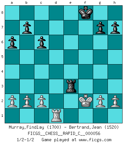 Last move : 1/2-1/2 2008 August 24 13:4:2 [Event "FICGS__CHESS__RAPID_C__000056"] [Site "FICGS"] [Date "2008.08.14"] [Round "1"] [White "Murray,Findlay"] [Black "Bertrand,Jean"] [Result "1/2-1/2"] [WhiteElo "1700"] [BlackElo "1520"] 1.e4 e5 2.Nf3 Nc6 3.Bb5 a6 4.Bxc6 dxc6 5.O-O f6 6.d4 Bg4 7.dxe5 Qxd1 8.Rxd1 fxe5 9.Rd3 Bd6 10.Nbd2 Nf6 11.Nc4 O-O 12.Nfxe5 Bh5 13.Nxd6 cxd6 14.Rxd6 Nxe4 15.Rd4 Nxf2 16.Be3 Rae8 17.Nd7 Rxe3 18.Nxf8 Nd1 19.Raxd1 Bxd1 20.Rxd1 Kxf8 21.Kf2 1/2-1/2 Ruy Lopez : Exchange, Gligoric variation Kingside Castling by player White (move 5) Kingside Castling by player Black (move 11) This chess game ended in a draw. Follow this game move after move (download)Chess is played with the mind and not with the hands ! (Renaud and Kahn) Ich verstehe Aljechins Kombinationen ganz gut; aber woher er diese Angriffschancen bekommt und wie er die Eröffnung behandelt das ist für mich ein Buch mit sieben Siegeln. (Rudolf Spielmann) No hay otro maestro que tenga una voluntad terrífica de ganar. Al tablero, el irradía peligro y aún los oponentes mas fuertes tienden a congelarse como liebres cuando olfatean a una pantera. Aún sus debilidades son peligrosas. Con las blancas, su juego de apertura es predecible - te es posible hacer planes en su contra - pero es tan fuerte que tus planes casi nunca funcionan. En el juego medio, su precisión e invención son fabulosas y en finales, tú simplemente no le puedes vencer. (Experto Alemán anónimo) Le plus grand jeu de l'esprit jamais inventé, plus vous l'apprenez, plus vous y prenez du plaisir. (Garry Kasparov) Life is like internet, nothing interesting, but noone want to leave it. (Ilmars Cirulis)