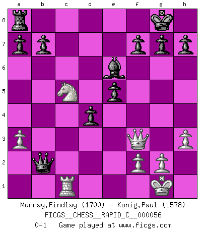 Last move : 0-1 2008 September 26 17:56:49 [Event "FICGS__CHESS__RAPID_C__000056"] [Site "FICGS"] [Date "2008.08.14"] [Round "1"] [White "Murray,Findlay"] [Black "Konig,Paul"] [Result "0-1"] [WhiteElo "1700"] [BlackElo "1578"] 1.e4 c5 2.c3 Nf6 3.e5 Nd5 4.d4 cxd4 5.cxd4 e6 6.Nf3 Bb4+ 7.Bd2 Nc6 8.a3 Bxd2+ 9.Nbxd2 O-O 10.Bc4 Qb6 11.Nb3 d6 12.O-O Rd8 13.Rc1 dxe5 14.Bxd5 Rxd5 15.Rc5 Nxd4 16.Rxd5 Nxf3+ 17.Qxf3 exd5 18.Rc1 Be6 19.h3 d4 20.Nc5 Qxb2 0-1 Sicilian : Alapin's variation (2.c3) Kingside Castling by player Black (move 9) Kingside Castling by player White (move 12) Player Black won this chess game. Follow this game move after move (download)The combination player thinks forward; he starts from the given position, and tries the forceful moves in his mind. (Emanuel Lasker) Wenn du gegen Bobby spielst, ist es keine Frage von gewinnen oder verlieren. Es ist eine Frage des Überlebens. (Boris Vassilievich Spassky) Combinaciones deslumbrantes son para la mayoría, mover madera es para los pocos. (Georg Kieninger) Les échecs sont utiles à l'exercice de la faculté de penser et à celle de l'imagination. Car nous devons posséder une méthode élaborée pour atteindre des buts partout où nous devons conduire notre raison. (Leibnitz) Nobody is always a winner, and anybody who says he is, is either a liar or doesn't play poker. (Amarillo Slim)