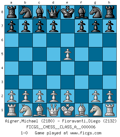 Last move : 1-0 2006 August 15 19:21:8 [Event "FICGS__CHESS__CLASS_A__000006"] [Site "FICGS"] [Date "2006.08.01"] [Round "1"] [White "Aigner,Michael"] [Black "Fioravanti,Diego"] [Result "1-0"] [WhiteElo "2180"] [BlackElo "2132"] 1.f4 e5 2.fxe5 1-0 Bird : From gambit Player White won this chess game. Follow this game move after move (download)Chess is a cold bath for the mind. (Sir John Simon) Die unerbitterlichsten Regeln im Schach sind die Ausnahmen. (Savielly Grigorievitsch Tartakower) Cada Peón es potencialmente una Reina. (James Mason) Même si l'adversaire joue le coup analysé précédemment, recommencez l'analyse en voyant la nouvelle position. Première règle de Blumenfeld Whenever people agree with me, I always feel I must be wrong. (Oscar Wilde)