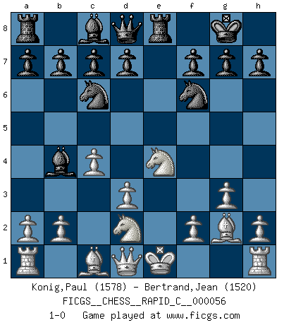 Last move : 1-0 2008 October 8 23:1:7 [Event "FICGS__CHESS__RAPID_C__000056"] [Site "FICGS"] [Date "2008.08.14"] [Round "1"] [White "Konig,Paul"] [Black "Bertrand,Jean"] [Result "1-0"] [WhiteElo "1578"] [BlackElo "1520"] 1.c4 e5 2.Nc3 Nf6 3.Nf3 Nc6 4.g3 Bb4 5.Bg2 O-O 6.d3 e4 7.Nd2 exd3 8.exd3 Re8+ 9.Nce4 1-0 This chess game has been lost on time (started : 2008.08.14 1:7:45) English Opening Kingside Castling by player Black (move 5) Player White won this chess game. Follow this game move after move (download)Chess is so inspiring that I do not believe a good player is capable of having an evil thought during the game. (Wilhelm Steinitz) Kombinieren und Schwarzhandel gehören verboten. (Savielly Grigorievitsch Tartakower) Una compensación adecuada por un sacrificio es tener una combinación sólida que conduce a una posición ganadora; una compensación adecuada por una metida de pata es dejar a tu oponente arrebatar una derrota de las fauces de la victoria. (Bruce A. Moon) Un millionnaire : 'Monsieur Steinitz ! Vous ne participez aux tournois que pour l'argent, alors que moi je n'y viens que pour l'honneur.' Steinitz : 'Chacun joue pour ce qu'il n'a pas'... Convictions are more dangerous enemies of truth than lies. (Friedrich Nietzsche)