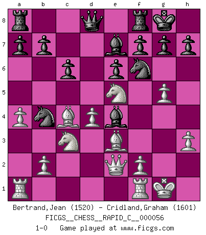 Last move : 1-0 2008 August 26 4:24:49 [Event "FICGS__CHESS__RAPID_C__000056"] [Site "FICGS"] [Date "2008.08.14"] [Round "1"] [White "Bertrand,Jean"] [Black "Cridland,Graham"] [Result "1-0"] [WhiteElo "1520"] [BlackElo "1601"] 1.d4 d5 2.c4 c6 3.Nf3 Nf6 4.Nc3 dxc4 5.a4 Na6 6.e4 Bg4 7.Bxc4 e6 8.Be3 Nb4 9.O-O Be7 10.h3 Bh5 11.Qe2 O-O 12.g4 Bg6 13.Ne5 Bxe4 14.g5 1-0 QGD Slav : Smyslov variation Kingside Castling by player White (move 9) Kingside Castling by player Black (move 11) Player White won this chess game. Follow this game move after move (download)Chess is a matter of delicate judgment, knowing when to punch and how to duck. (Bobby Fischer) Dieses schreckliche Gefühl, dass ich gegen eine Maschine spielte, die niemals Fehler macht, zerschmetterte meinen Widerstand. (Mark Taimanov) El jugador blanco perdió porque fallo en recordar la coreccta continuación y tuvo que pensar por sí mismo las movidas. (Siegbert Tarrasch) Le jeu d'échecs fait naître et fortifie en nous plusieurs qualités précieuses dans le cours de l'existence, telles que la prévoyance, la circonspection, la prudence, et la persévérance. (Benjamin Franklin - 1783, la morale des échecs) The quality of decision is like the well-timed swoop of a falcon which enables it to strike and destroy its victim. (Sun Tzu)