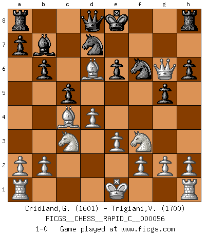 Last move : 1-0 2008 August 25 0:2:23 [Event "FICGS__CHESS__RAPID_C__000056"] [Site "FICGS"] [Date "2008.08.14"] [Round "1"] [White "Cridland,Graham"] [Black "Trigiani,Vincenzo"] [Result "1-0"] [WhiteElo "1601"] [BlackElo "1700"] 1.d4 d5 2.c4 c6 3.Nf3 Nf6 4.Nc3 e6 5.Bg5 h6 6.Bh4 Bd6 7.e3 g5 8.Bg3 b6 9.cxd5 Nbd7 10.dxe6 fxe6 11.Qc2 Ba6 12.Bxd6 Bb7 13.Bc4 c5 14.Qg6+ 1-0 QGD Slav : 4.Nc3 Player White won this chess game. Follow this game move after move (download)Live, lose, and learn, by observing your opponent how to win. (Amber Steenbock) Ich würde die 30 stärksten Spieler der USA im Simultanspiel besiegen. (José Raúl Capablanca) Combinaciones deslumbrantes son para la mayoría, mover madera es para los pocos. (Georg Kieninger) Le joueur d'Echecs qui veut atteindre le top est obligé de développer son propre credo créatif. Alexeï Stepanovicth Souétine. Il est facile d'écrire des livres ! Ce qui est difficile, c'est de jouer ! (Alexeï Stepanovicth Souétine) Just because you do not take an interest in politics doesn't mean politics won't take an interest in you. (Pericles 430 B.C.)