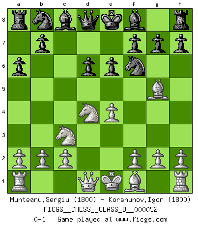 Last move : 0-1 2008 October 9 11:4:27 [Event "FICGS__CHESS__CLASS_B__000052"] [Site "FICGS"] [Date "2008.08.14"] [Round "1"] [White "Munteanu,Sergiu"] [Black "Korshunov,Igor"] [Result "0-1"] [WhiteElo "1800"] [BlackElo "1800"] 1.e4 c5 2.Nf3 d6 3.d4 cxd4 4.Nxd4 Nf6 5.Nc3 a6 6.Bg5 e6 0-1 This chess game has been lost on time (started : 2008.08.14 18:22:3) Sicilian : Najdorf, 6...e6 Player Black won this chess game. Follow this game move after move (download)It was clear to me that the vulnerable point of the American Grandmaster (Bobby Fischer) was in double-edged, hanging, irrational positions, where he often failed to find a win even in a won position. (Efim Geller) Schach ist das Spiel, das die Verrückten gesund hält. (Albert Einstein) El Ajedrez es un juego de pelea el cual es puramente intelectual e incluye la suerte. (Richard Reti) Il n'y a pas eu de défaite parce que je ne crois pas que cet ordinateur ait jamais existé. IBM a triché en refusant d'imprimer les modes de recherche de la machine. C'est évident, pendant le match, des coups décisifs ont été joués par des êtres humains. Aujourd'hui, les meilleurs spécialistes en informatique ne peuvent toujours pas expliquer comment Deep-Blue a pu jouer contre la logique des ordinateurs. IBM a gagné une guerre de communication, mais ils sont incapables de prouver que l'ordinateur a gagné tout seul. (Garry Kasparov) If you ain't just a little scared when you enter a casino, you are either very rich or you haven't studied the games enough. (Pappy)