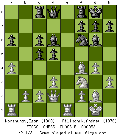 Last move : 1/2-1/2 2008 September 6 21:59:43 [Event "FICGS__CHESS__CLASS_B__000052"] [Site "FICGS"] [Date "2008.08.14"] [Round "1"] [White "Korshunov,Igor"] [Black "Pilipchuk,Andrey"] [Result "1/2-1/2"] [WhiteElo "1800"] [BlackElo "1876"] 1.e4 c5 2.Nf3 Nc6 3.Bb5 d6 4.O-O Bd7 5.Re1 a6 6.Bf1 Bg4 7.d3 Nf6 8.h3 Bh5 9.Bf4 e6 10.Nbd2 Be7 11.a4 O-O 12.g4 Bg6 13.Nc4 d5 14.exd5 exd5 15.Nce5 Bd6 16.Bg2 Rc8 17.Nxc6 bxc6 18.Qd2 1/2-1/2 Sicilian : Nimzovich-Rossolimo attack (without ...d6) Kingside Castling by player White (move 4) Kingside Castling by player Black (move 11) This chess game ended in a draw. Follow this game move after move (download)Capture of the adverse King is the ultimate but not the first object of the game. (William Steinitz) Karpov ist ein Museumsstück. (Garry Kasparov) Cuando me preguntan: -¿Cual es el secreto que te hace hacer mejores movidas que tus oponentes?, Yo respondo: Me da gusto que me pregunten eso, porque, como veran, hay una simple razón. Yo pienso mis propias movidas y dejo a mi oponente que el piense las suyas. (Alexander Alekhine) Si je n'étais pas joueur d'échecs, je serais le meilleur dans quelque chose d'autre. (Anatoli Karpov) We're missing something. (Gregory House, House M.D.)