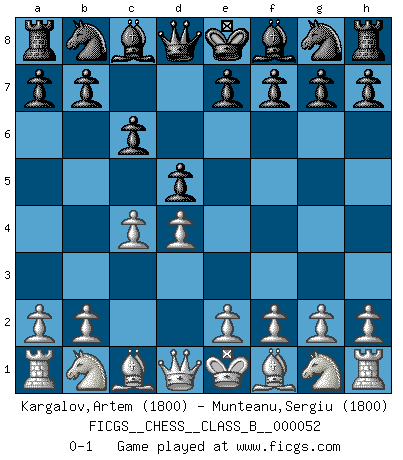 Last move : 0-1 2008 September 25 22:26:9 [Event "FICGS__CHESS__CLASS_B__000052"] [Site "FICGS"] [Date "2008.08.14"] [Round "1"] [White "Kargalov,Artem"] [Black "Munteanu,Sergiu"] [Result "0-1"] [WhiteElo "1800"] [BlackElo "1800"] 1.d4 d5 2.c4 c6 0-1 This chess game has been lost on time (started : 2008.08.14 18:22:3) QGD Slav defense Player Black won this chess game. Follow this game move after move (download)Only the player with the initiative has the right to attack. (Wilhelm Steinitz) Das Schachspiel übertrifft alle anderen Spiele so weit wie der Chimborasso einen Misthaufen. (Arthur Schopenhauer) Ayuda a tus piezas para que ellas te puedan ayudar. (Paul Morphy) Ne tendez aucun piège pour le plaisir ! Ne jouez rien dans l'espoir que l'adversaire réagisse de façon stupide ! Prenez toujours pour acquis que l'adversaire va trouver le meilleur coup ! Ne jouez jamais de coup dans l'espoir que l'adversaire ne voie pas la menace ! Chacun de vos coups doit améliorer la position d'une façon ou d'une autre. Programmer - an organism that turns coffee into software. (Anonymous)