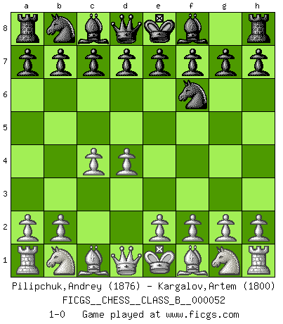 Last move : 1-0 2008 September 24 22:25:17 [Event "FICGS__CHESS__CLASS_B__000052"] [Site "FICGS"] [Date "2008.08.14"] [Round "1"] [White "Pilipchuk,Andrey"] [Black "Kargalov,Artem"] [Result "1-0"] [WhiteElo "1876"] [BlackElo "1800"] 1.d4 Nf6 2.c4 1-0 This chess game has been lost on time (started : 2008.08.14 18:22:3) Queen's pawn game Player White won this chess game. Follow this game move after move (download)Chess is the gymnasium of the mind. (Blaise Pascal) Jeder Schachmeister war einmal ein Anfänger. (Irving Chernev) Botvinnik trataba de restarle el misterio al Ajedrez, siempre relacionandolo a situaciones de la vida ordinaria. El gustaba de llamar al Ajedrez un típico problema inexacto similar a aquellos de los cuales la gente siempre tiene que enfrentarse en la vida cotidiana. (Garry Kasparov) Le système Elo représente seulement une moyenne. Il est simplement un indicateur de votre stabilité. (Anatoli Karpov) The right perception of any matter and a misunderstanding of the same matter do not wholly exclude each other. (Kafka's the trial)