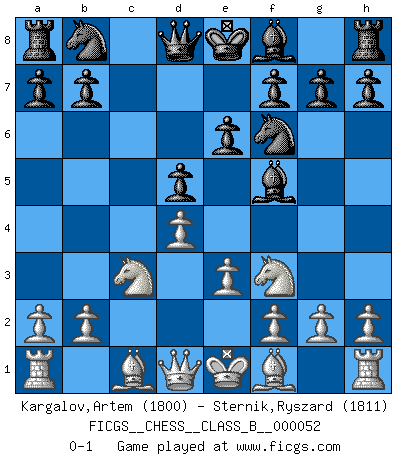 Last move : 0-1 2008 September 24 10:25:0 [Event "FICGS__CHESS__CLASS_B__000052"] [Site "FICGS"] [Date "2008.08.14"] [Round "1"] [White "Kargalov,Artem"] [Black "Sternik,Ryszard"] [Result "0-1"] [WhiteElo "1800"] [BlackElo "1811"] 1.Nf3 d5 2.d4 Nf6 3.c4 c6 4.e3 Bf5 5.Nc3 e6 6.cxd5 cxd5 0-1 This chess game has been lost on time (started : 2008.08.14 18:22:3) Reti Opening Player Black won this chess game. Follow this game move after move (download)Examine moves that smite! A good eye for smites is far more important than a knowledge of strategical principles. (Purdy) Ich bin es gewohnt, das die Jugend mir überhaupt keinen Respekt entgegenbringt. (Alexander Morozewich) EL Ajedrez es como la vida. (Boris Spassky) Les échecs, c'est l'art d'analyser. (Mikhail Botvinnik) Every man's memory is his private literature. (Aldous Huxley)