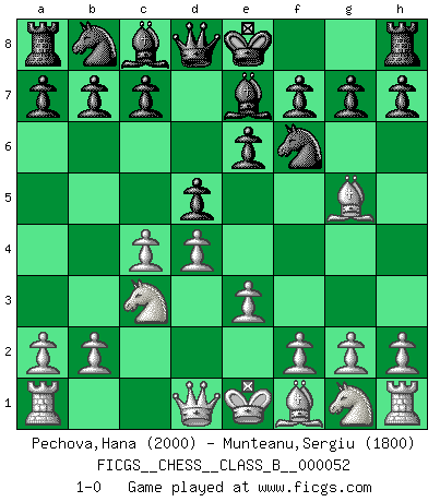 Last move : 1-0 2008 October 15 11:32:12 [Event "FICGS__CHESS__CLASS_B__000052"] [Site "FICGS"] [Date "2008.08.14"] [Round "1"] [White "Pechova,Hana"] [Black "Munteanu,Sergiu"] [Result "1-0"] [WhiteElo "2000"] [BlackElo "1800"] 1.d4 d5 2.c4 e6 3.Nc3 Nf6 4.Bg5 Be7 5.e3 1-0 This chess game has been lost on time (started : 2008.08.14 18:22:3) QGD : 4.Bg5 Be7 Player White won this chess game. Follow this game move after move (download)During a Chess competition a Chessmaster should be a combination of a beast of prey and a monk. (Alexander Alekhine) Ich hatte meine größten Erfolge, als ich 47 Jahre alt war. Kasparow war noch nicht mal 42 und hat das Schach schon im Stich gelassen. (Viktor Kortschnoi) A través de las casillas del tablero, los Indios explican el movimiento del tiempo y la edad, las influencias mas altas que controlan el mundo y los lazos que vinculan al Ajedrez con el alma humana. (Al-Masudi) Les sacrifices démontrent seulement que quelqu'un a gaffé. (Savielly Tartacover) You can't play chess if you're groggy from pills. (Anatoly Karpov)