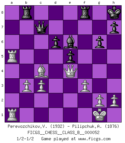 Last move : 1/2-1/2 2008 September 25 19:8:53 [Event "FICGS__CHESS__CLASS_B__000052"] [Site "FICGS"] [Date "2008.08.14"] [Round "1"] [White "Perevozchikov,Vjacheslav"] [Black "Pilipchuk,Andrey"] [Result "1/2-1/2"] [WhiteElo "1932"] [BlackElo "1876"] 1.e4 c5 2.Nf3 Nc6 3.d4 cxd4 4.Nxd4 Nf6 5.Nc3 e5 6.Ndb5 d6 7.Bg5 a6 8.Na3 b5 9.Nd5 Be7 10.Bxf6 Bxf6 11.c3 O-O 12.Nc2 Bg5 13.a4 bxa4 14.Rxa4 a5 15.Bc4 Rb8 16.b3 Kh8 17.Nce3 g6 18.O-O f5 19.Qd3 Be6 20.f3 Bxe3+ 21.Qxe3 fxe4 22.Qxe4 Ne7 23.Nxe7 Qxe7 24.Rxa5 Qc7 25.Rfa1 1/2-1/2 Sicilian : Pelikan (Lasker/Sveshnikov) variation Kingside Castling by player Black (move 11) Kingside Castling by player White (move 18) This chess game ended in a draw. Follow this game move after move (download)Who is your opponent tonight, tonight I am playing against the Black pieces. (Akiba Rubinstein) Fallen sollten polizeilich verboten werden. (Savielly Grigorievitsch Tartakower) Las Aperturas te enseñan aperturas. ¡Los Finales te enseñan Ajedrez!. (Stephan Gerzadowicz) Le jeu d'échecs fait naître et fortifie en nous plusieurs qualités précieuses dans le cours de l'existence, telles que la prévoyance, la circonspection, la prudence, et la persévérance. (Benjamin Franklin - 1783, la morale des échecs) You have to believe in yourself. (Sun Tzu)